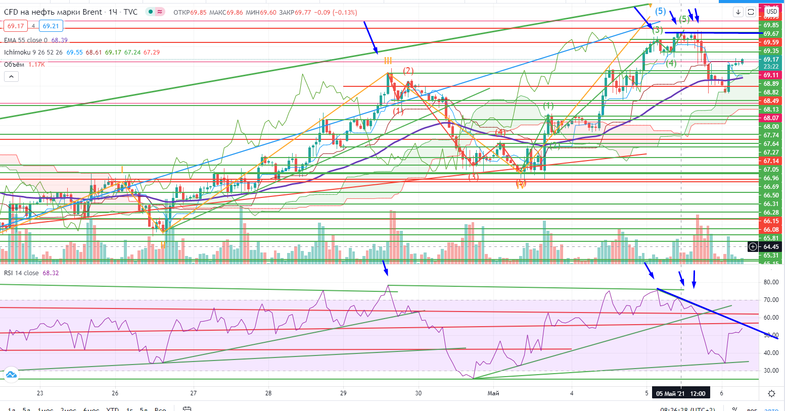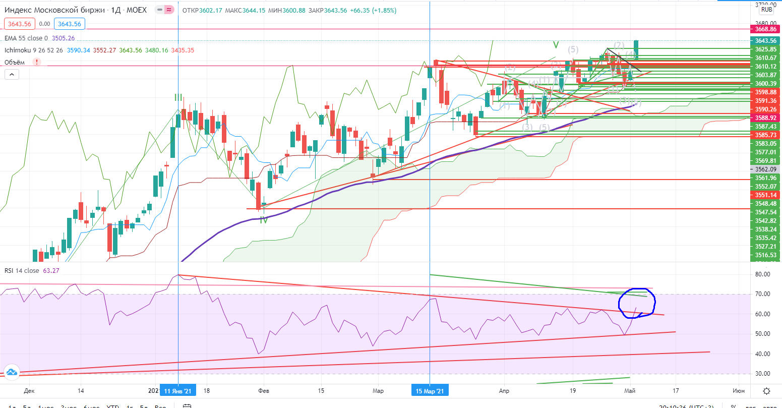 Но тем не менее Индекс ММВБ плотно вышел на новый исторический хай, RSI это подтверждает, лонг побеждает в моменте!!!