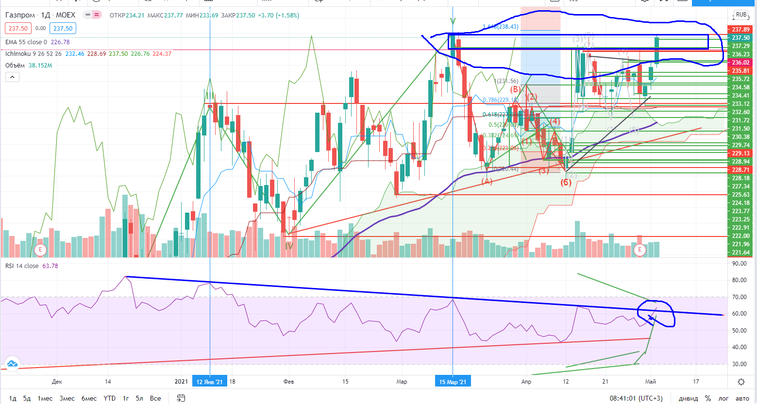 Газпром в зоне турбулентности 236-237,8, RSI накернивает тренд, но пока все неочевидно, нужно ждать развязки… Пока в бумаге без идей.