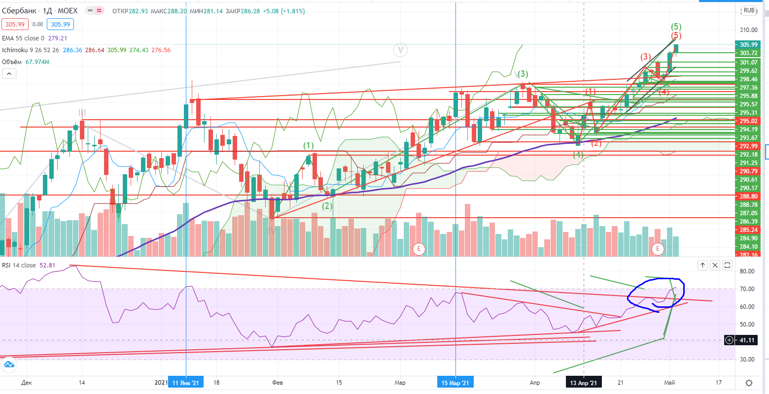 Сбер-новый исторический хай, противоречий лонгу кроме нахождения RSI в зоне перекупленности и потенциальной дивергенции (которая будет висеть еще долго) нет!!! Близость дивидендов все таки берет свое….