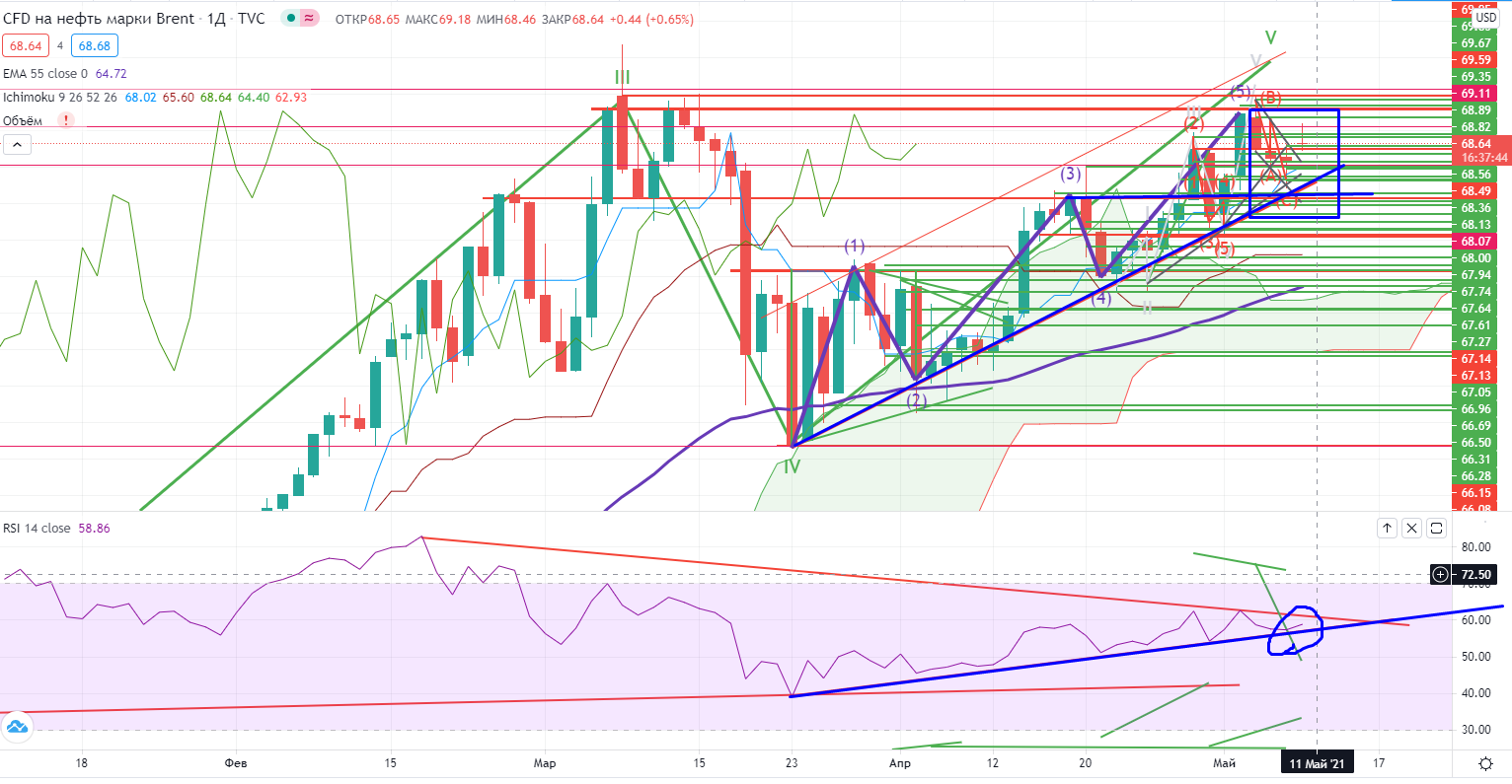 А вот нефть на пороге слома растущей тенденции. Нефть на днях пока находится выше реперного уровня 3-ей волны роста 67,1, плюс тренд. Проход и закрытие ниже может перерасти в паническое закрытие быков и слом растущего тренда… А от нефти очень многое зависит для нашего фондового рынка, и пока эта ситуация висит над рынком я лично НИЧЕГО ДЕЛАТЬ НЕ БУДУ!!!