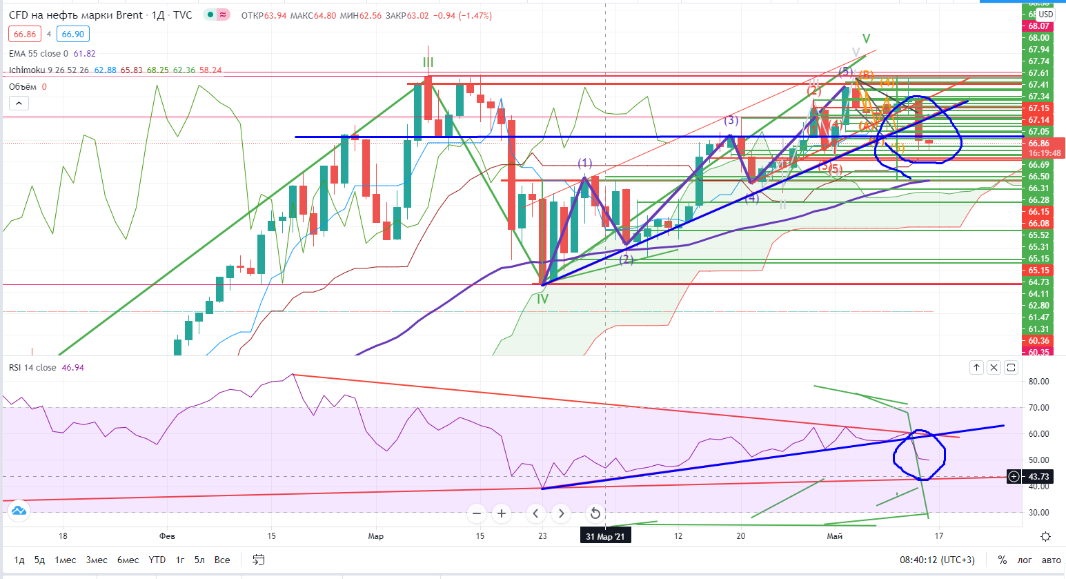 А вот в нефти вчера была интрига! Пытались пробивать несколько раз дневную поддержку $67,1, и под вечер это удалось сделать. Правда вызывает сомнение, уж очень слабый был пробой, нужно доказательство еще одним днем. Но нефть такой инструмент, что в любой момент может попытаться вернуться назад. Постоянные геополитические конфликты к примеру на Ближнем Востоке могут сломать всю технику. Короче говоря как ни странно, медведям в этой ситуации все равно расслабляться не надо. Но растущий тренд поломан, а с учетом нахождения нефти в 5-ой подволне V-ой основной волны и дивергенцией на них думаю, что можно торговать от шорта!!!