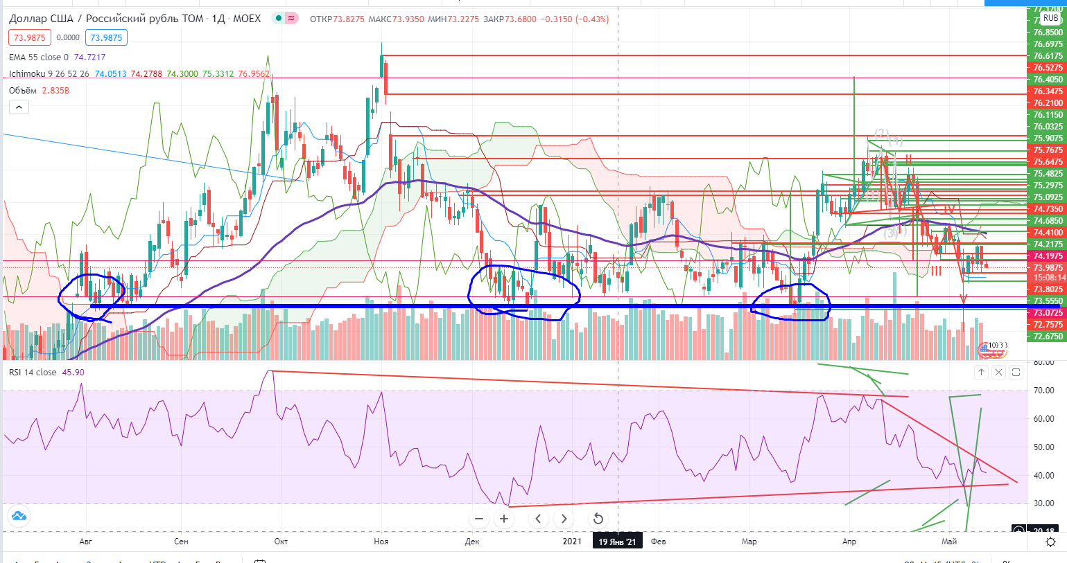 Но... идея с отношением прибыль-риск нужна в любом виде работать. В частности пара доллар рубль. От покупки рубля, ну сколько Вы заработаете? Ну еще 1-1,5 от текущих цен. Зато в случае шухера, который может начаться в ЛЮБОЙ МОМЕНТ Вы можете заработать во много раз больше. Вот поэтому в паре я остаюсь БЫКОМ, но покупать просто так не хочу, жду падения и при сформировавшейся уже поддержке и при наличии разворотного паттерна я начну спекулятивно покупать, но про стопы я никогда не забываю, ведь это спекулятивный лонг. А СТРАТЕГИЧЕСКИЙ БАКС Я ДЕРЖУ НА ДРУГОМ СЧЕТУ!!!