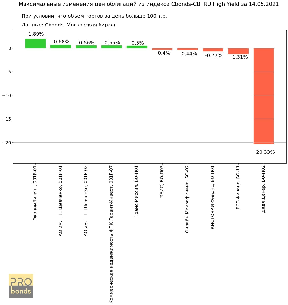 Максимальные изменения цен облигаций из индекса Cbonds-CBI RU High Yield за 14.05.2021
