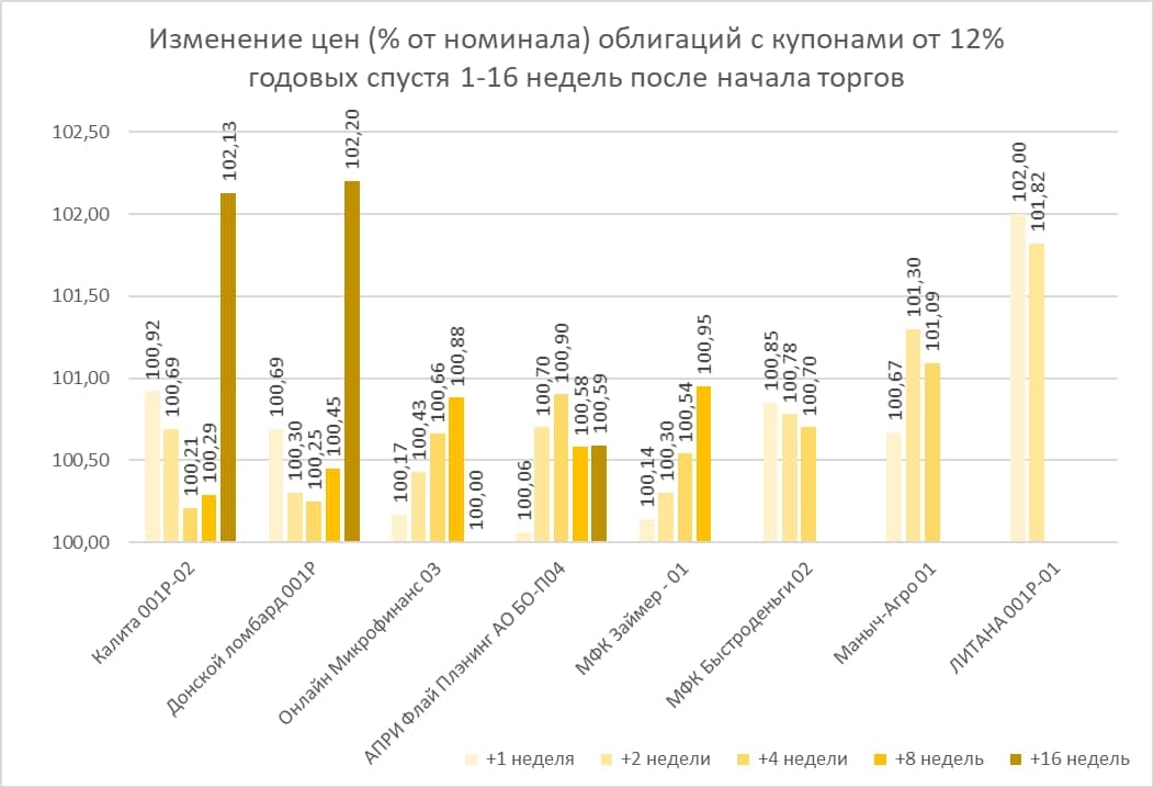 Как менялись цены облигаций с купонами 12% и выше после размещения
