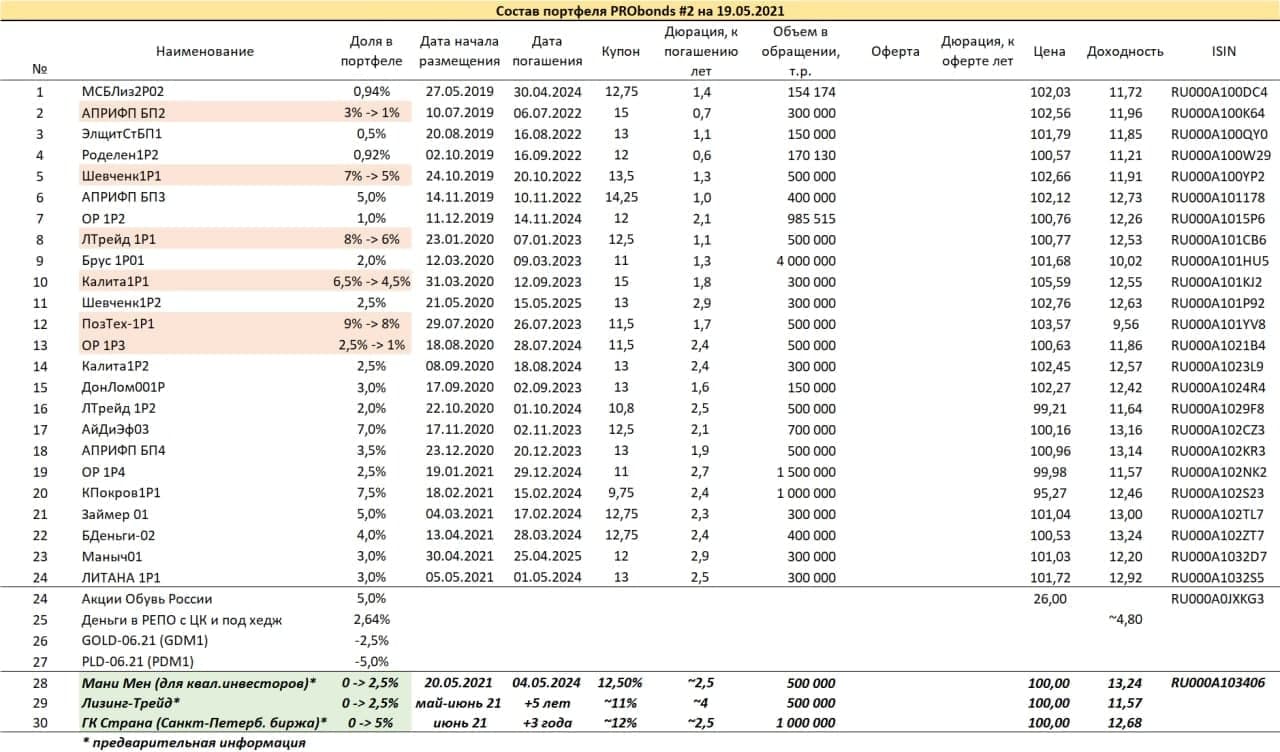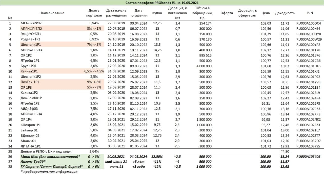 До конца мая и в течение июня произойдет несколько новых облигационных включений в портфели. Ближайшее – завтра 20 мая, размещаемый выпуск облигаций «Онлайн Микрофинанс» под поручительство МФК «Мани Мен» (предварительное наименование Мани Мен 01, только для квалифицированных инвесторов, кредитный рейтинг ruBBB-, купон 12,5% годовых, 500 млн.р., 3 года до погашения). Под новые приобретения из портфелей будут частично выводиться некоторые выпуски, давно находящиеся в портфелях. Они указаны в приведенных таблицах.
