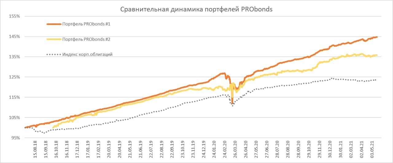Текущая доходность облигационного портфеля PRObonds #1 (за последние 365 дней) – 14,6%. Смешанный портфель #2 принес 9,9%. С начала 2021 года портфель #1 прибавил 3,4% (9% в годовом исчислении), что на 0,2% превышает прирост базового индекса Cbonds-CBI RU High Yield, даже несмотря на падение в начале апреля облигаций Концерна «Покровский».