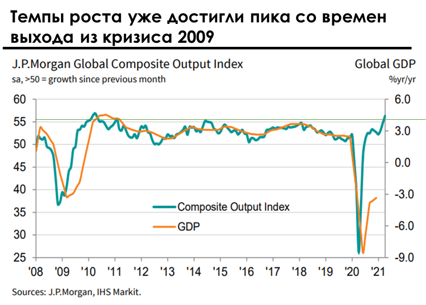 PMI ежемесячно показывают, улучшается или ухудшается ситуация в экономике и отдельных секторах. Например, сейчас PMI на максимумах, то есть, чтобы экономика продолжала ускоряться, ему нужно будет обновить максимумы последних 12 лет: