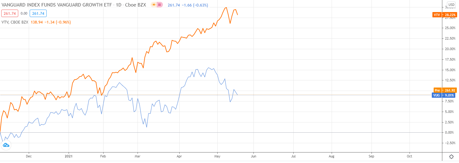 Вот как вели себя акции роста и акции стоимости последние полгода (акции роста — голубой график, акции стоимости — оранжевый):