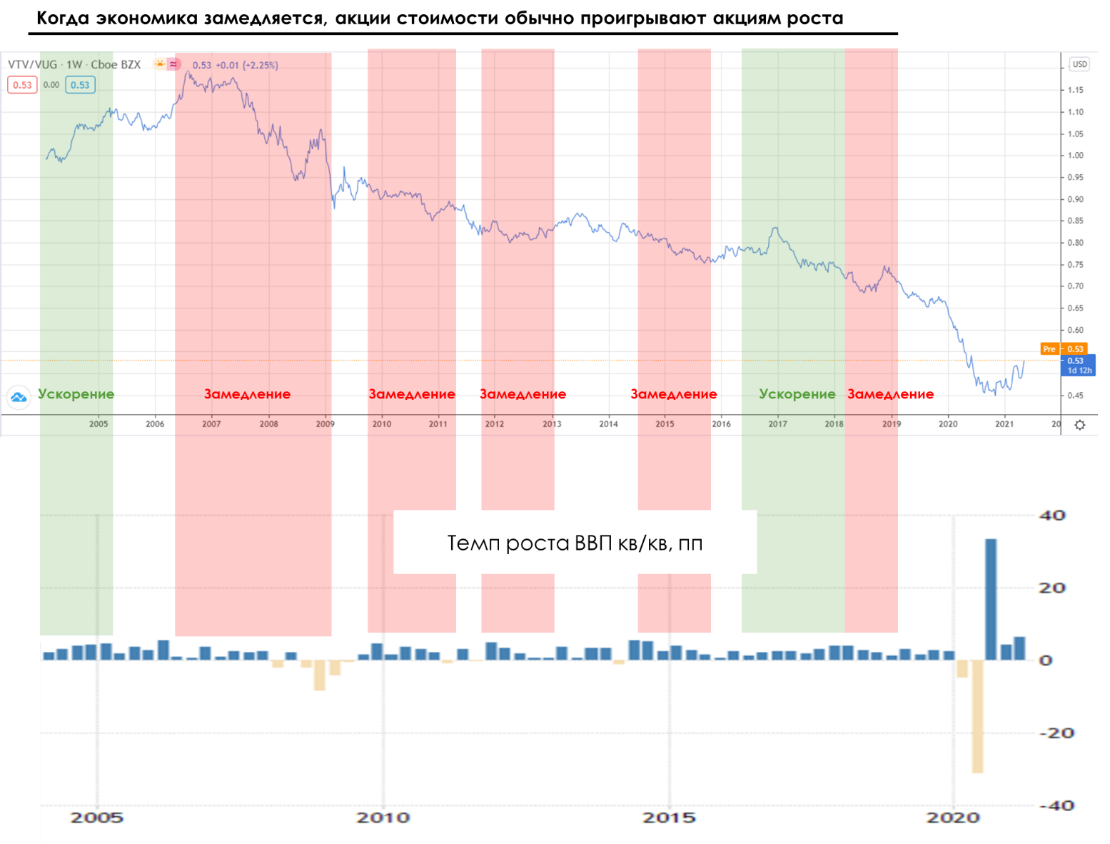 В результате происходит инфляционный рост ВВП, главным бенефициаром которого становятся компании-производители сырья и товаров (то есть акции стоимости). Логично, что в этот период акции сырьевых компаний перетягивают на себя внимание рынка и вытягивают спекулятивные деньги из акций роста.