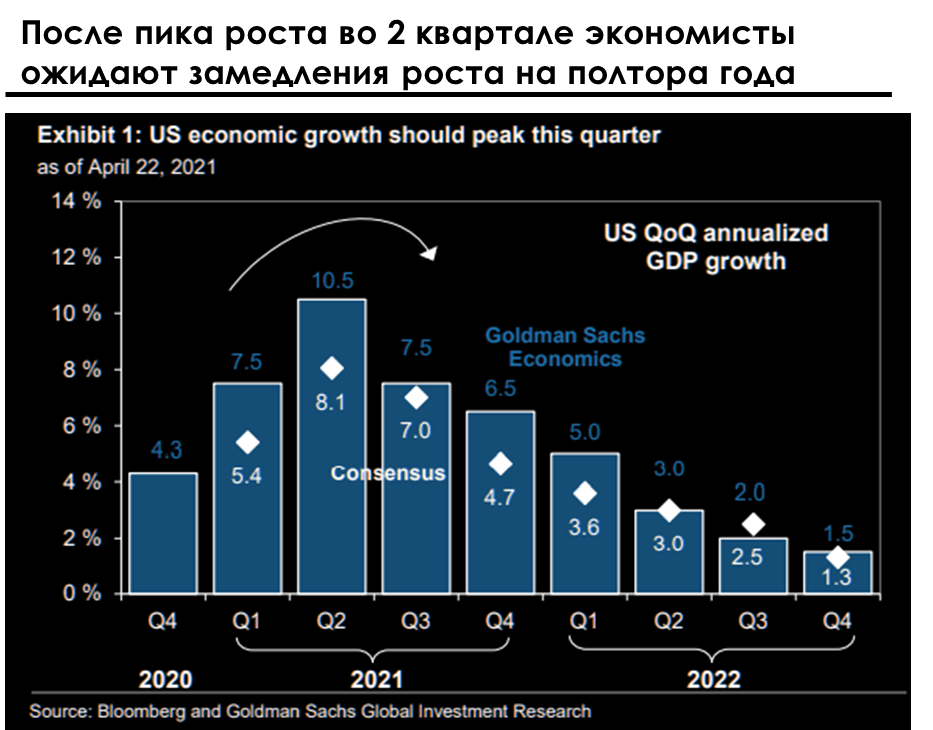 Глобальные макроэкономисты ожидают, что, начиная с третьего квартала (то есть с июля 2021), уже начнется замедление роста в США. И это обусловлено не высокой базой г/г второго квартала — на графике ниже динамика квартал к кварталу, приведенная к годовым цифрам.