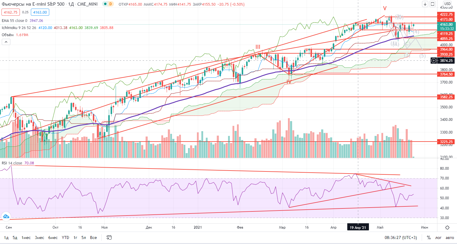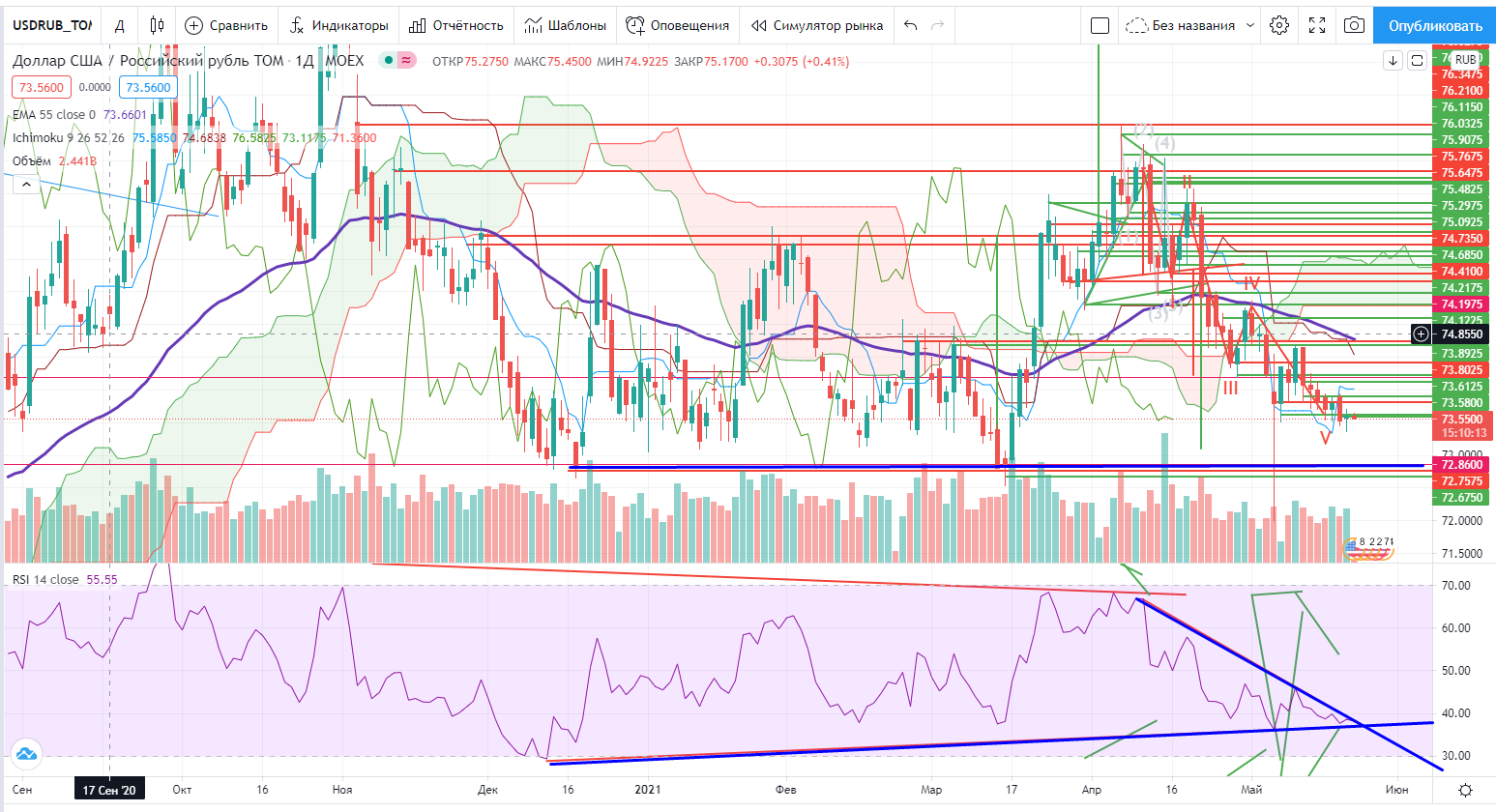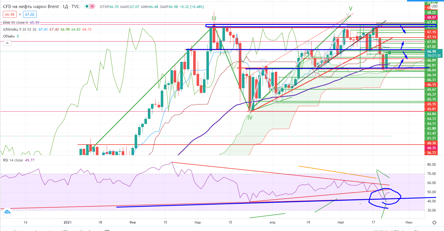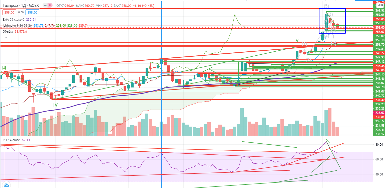 Теперь к бумагам. Я и раньше негативно относился к Газпрому, и после этой недели моя негативность только усилилась. На информации о дивидендах он локально в пятницу «выстрелил» вверх, но потом снова вернулся обратно к своей поддержке 258+. И главное, он зашел в облако Ишимоку и почти пробил его вниз. И это при растущем остальном рынке. Ставка на рост на информации по дивидендам ( https://www.finam.ru/analysis/marketnews/reshenie-po-dividendam-v-gazprome-mozhet-stat-draiyverom-dlya-dvizheniya-vverx-20210520-10400/) не сработала. Да и «типа отмененные санкции» уже отработали, но далеко не факт, что их не введут позже. Короче говоря пришлось закрыть лонг в нем от греха подальше и заняться поиском других бумаг для торговли. Я не исключаю в Газпроме ЛЮБОГО РАЗВИТИЯ СОБЫТИЙ, 50/50, а это рулетка, а не торговля.