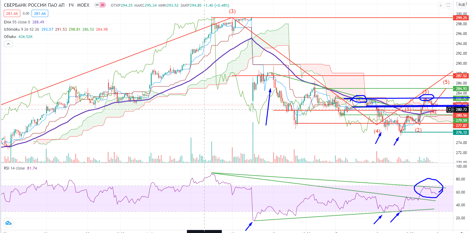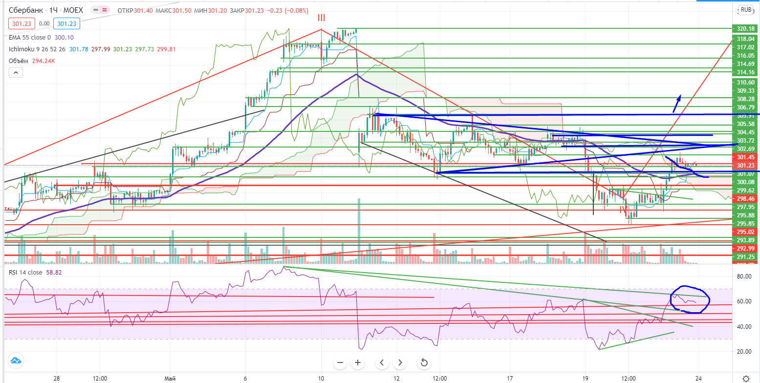Надо вспомнить мое предположение о глобальном состоянии Сбера. На историческом хаю не было дивергенции на днях, а значит его повтор (хоть и гипотетически) возможен. Сбер на днях отталкивался от поддержки в виде горизонтальной зоны и 55EMA, RSI в скоплении дивергентных трендах. Но мешало нахождение ниже облака Ишимоку и 55EMA на часах, которое в пятницу было проколото вверх. Из этого я делаю выводы, что при прочих равных Сбер может подрасти еще. Ему на днях надо преодолеть уровень 302+, и снова встанет вопрос о возможности похода на закрытие дивидендного гэпа. Но для этого надо более плотнее выйти над облаком Ишимоку.