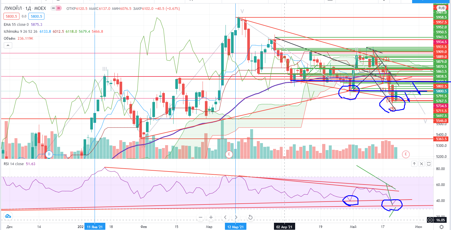 Лукойл на днях (впрочем как и Роснефть) находится ниже зоны продажи (55EMA и облако Ишимоку), не было дивергенции на локальном лоу, а значит повтор как минимум возможен. Закрылся под горизонтальным уровнем 5805, что дает право думать, что пятничный отрост имел под собой больше эмоциональный окрас. И даже если он в моменте его пройдет, все равно он будет ниже зоны продажи и следующее сопротивление будет находиться под 5890-5901, на котором можно также продавать.