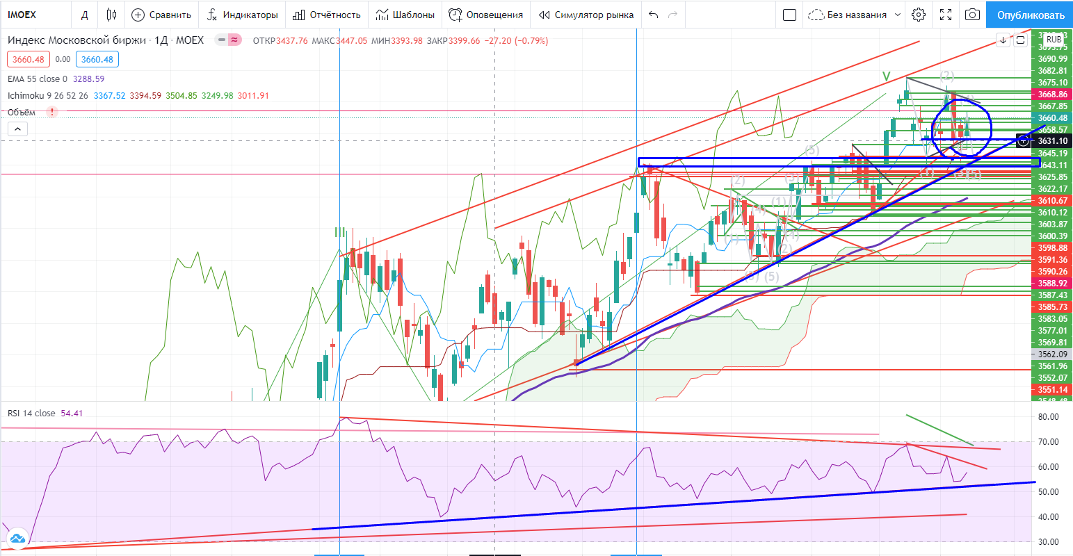 Индекс ММВБ рисует разворотную формацию вверх. Но четкого тренда вниз на днях все таки не было, элементарная пила. В течении недели он тестировал зону поддержки и почти тестировал тренд. Он пока на днях выше зоны покупки, причем достаточно сильно (55EMA и облако Ишимоку заметно ниже), и горизонтальная поддержка и тренд не взят. Так что формально он пока в лонге, хоть мне этого в моменте и не хочется. Но надо это признать.