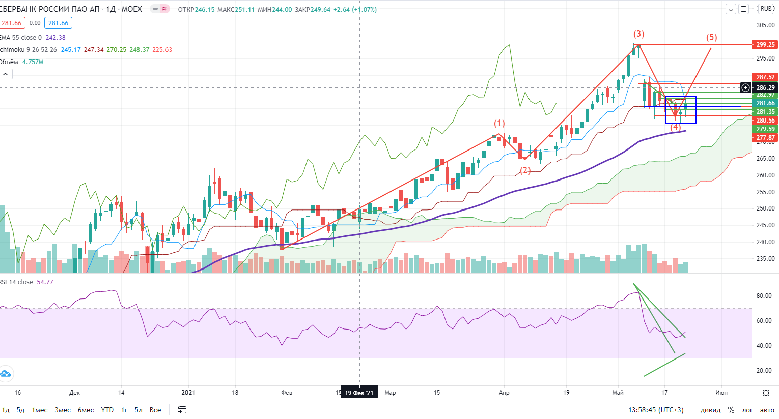 А вот в Сбере-преф ситуация менее запутанная. Он на днях также рисует возможность похода наверх с точки зрения волн, закрылся выше сопротивления 280,59. И на часах он более отчетливо вышел выше облака Ишимоку, нарисовав предварительно очень заметную дивергенцию. Я если честно уже присматривался к этой бумаге, но не решался в нее входить из-за «старшего брата», но теперь ситуация поменялась. Сбер-преф теперь в лонге, но в осторожном(!), в «голую» им торговать также опасно из за близости к мощному уровню сопротивления 283 (которое также в пятницу было проверено на прочность, но безрезультатно). Пока рисуется возможность сформировать 5-ю локальную волну отскока, но надо смотреть, ведь если бумага пройдет 283+ и RSI пробьет тренд (пока эта вероятность слаба), то можно будет перестраивать график с точки зрения волн и может оказаться, что это всего-лишь 3-я. Но надо смотреть.