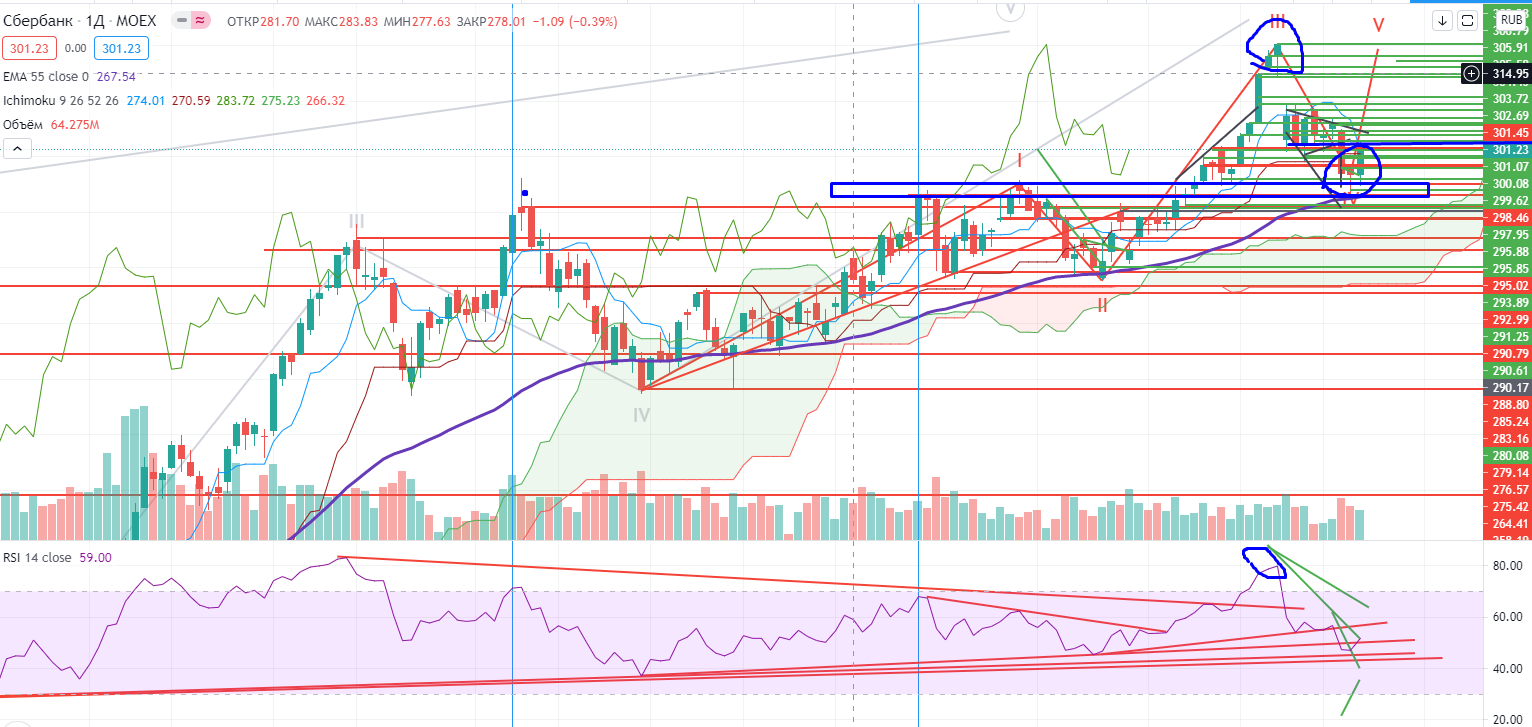 После прохода Сбером уровня 301,44 ничего делать нельзя. Он выше облака Ишимоку, выше 55EMA, но здесь скопление сопротивлений, любой из них может сработать… Пробой крайнего сопротивления 308,42+ = однозначно от покупки...