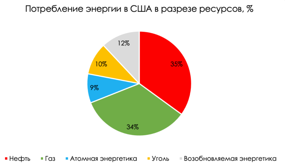 Согласно данным EIA (Управление энергетической информации в США), около 80% потребляемой энергии (в перерасчете на Британскую тепловую единицу) в стране приходится на ископаемые виды топлива (нефть, газ, углеродистые жидкости, уголь).