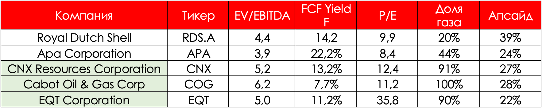 Среди всех нефтегазовых компаний, акции которых представлены на бирже СПб, были выбраны те, которые имеют наибольшую экспозицию на рынок газа. В таблице зеленым цветом выделены компании, у которых реализация природного газа и сжиженного природного газа занимает более 90% всех доходов. Однако стоит отметитьRoyal Dutch Shell. Несмотря на то, что реализация газа занимает 20% от совокупной выручки, энергетический холдинг активно ведет экспансию в сторону возобновляемых источников энергии, в частности, в сторону производства биотоплива и электроэнергии через ветер.