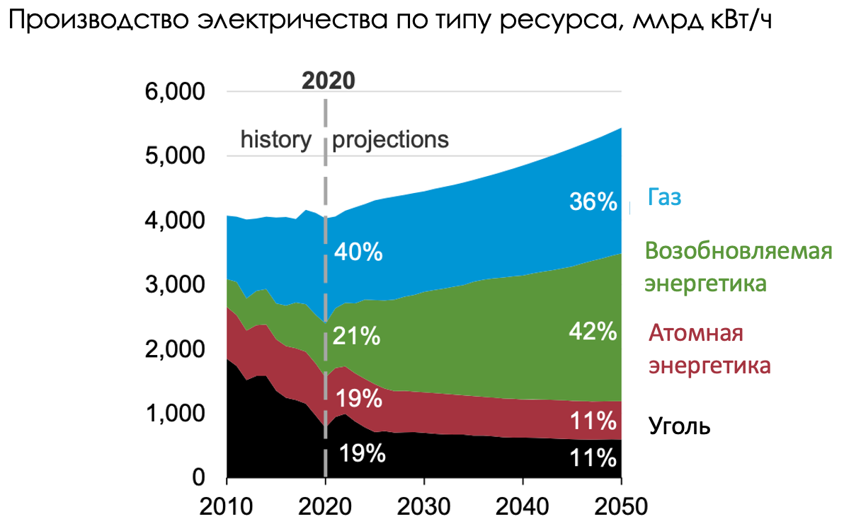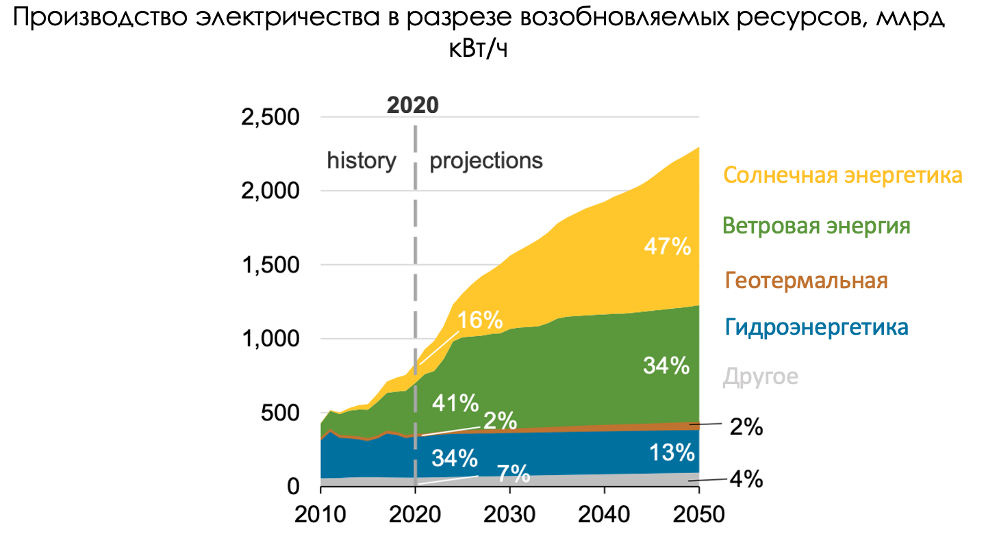 Более быстрый темп роста возобновляемой энергетики в сравнении с другими источниками потребления, а где-то замещение в случае с углем, — результат планомерной декарбонизации электрогенерирующих мощностей (38,5% потребляемых ресурсов) в рамках программы нулевых выбросов, а также усиления повестки ESG для промышленных потребителей (24% потребляемых ресурсов) и транспортной отрасли (26% потребляемых ресурсов) через электрификацию. Например, уже по итогам 2020 года на возобновляемые источники энергии приходилось около 21% вырабатываемого электричества, а к 2050 году ожидается, что доля удвоится за счет замещения ископаемых видов топлива. Это станет возможным также благодаря снижению затрат на производство 1 кВт/ч.