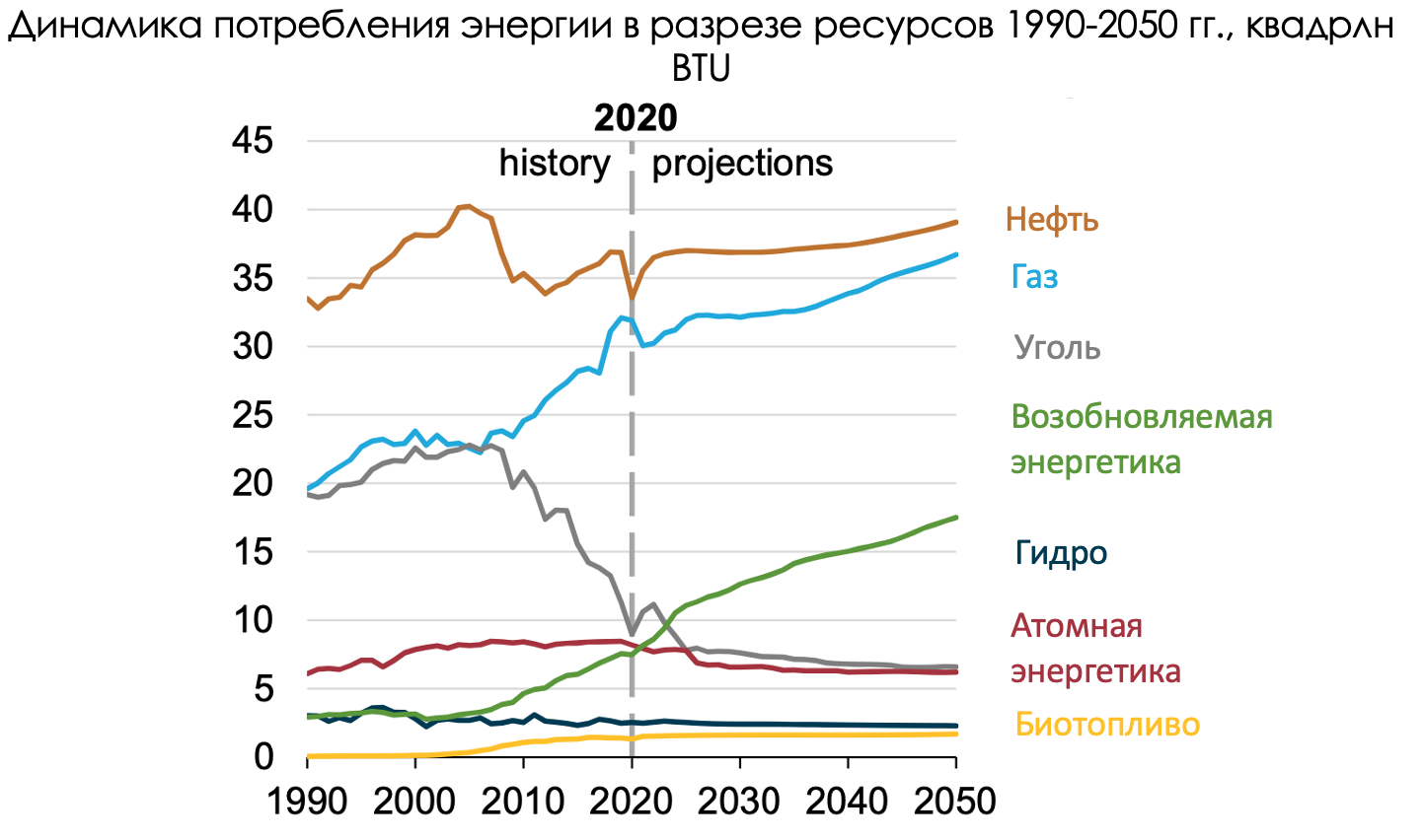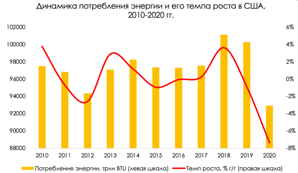 Снижение было вызвано в первую очередь уменьшением спроса на углеродистые продукты (нефть, газ, уголь) со стороны производственных компаний и электрогенерирующих станций. Однако возобновляемые источники энергии показали свой рост за счет ветрогенерации и солнечной энергетики, увеличившись на 2,1% г/г до 11,6 квадриллионов BTU. Согласно прогнозу EIA, потребление возобновляемых источников энергии (без учета гидроэнергетики и биотоплива) к 2050 году вырастет до ~17 квадриллионов BTU c 7 квадриллионов BTU в 2020 году, а среднегодовой темп роста составит 3,1% г/г.