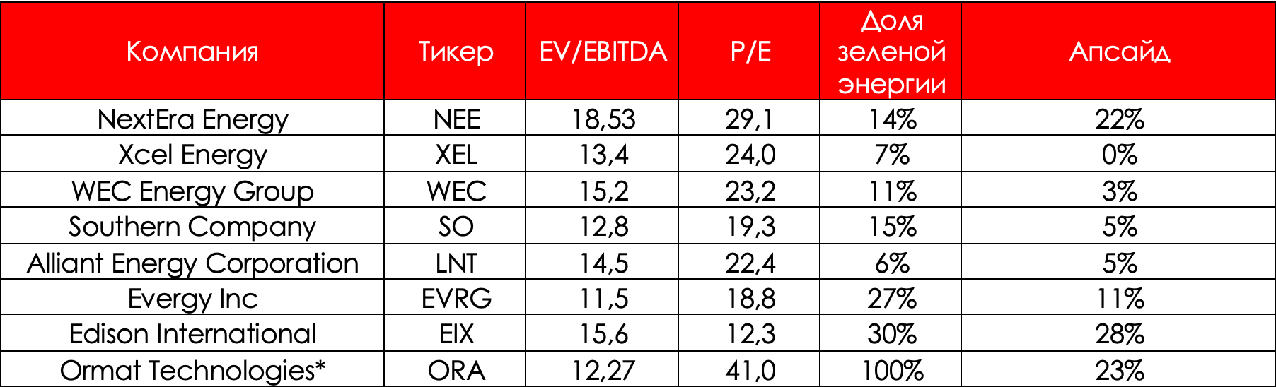На текущий момент доля возобновляемых источников энергии (без учета атомных электростанций) в энергетическом миксе традиционных генерирующих компаний не превышает и 30%. В свою очередь, рассматриваемые компании имеют внушительные пайпланы по декарбонизации своих производственных мощностей к 2030 году. Также необходимо понимать, что электрогенерирующие компании будут наращивать свои капитальные затраты в последующие годы для постройки полностью свободных от выбросов углерода станций в целях замещения существующих угольных мощностей (в среднем около 15-20% от доли вырабатываемой энергии).
