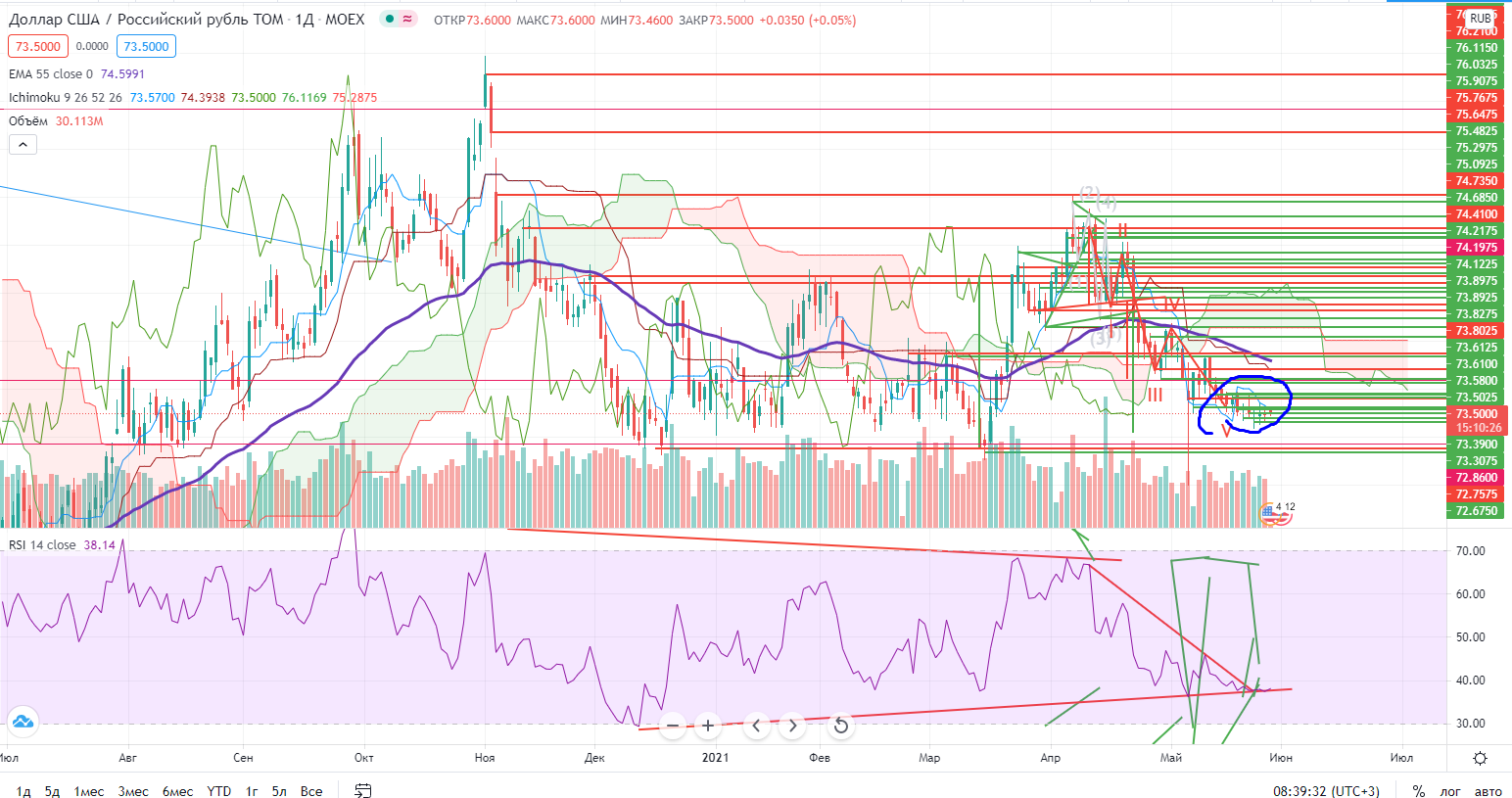 USDRUB ведет себя достаточно необычно, такое впечатление что государство покупает валюту. Рубль не растет, хотя по идее должен был. Это тоже косвенная причина возможного разворота. Сейчас государство накупиться на локальном лоу, и в случае любого шухера будет раздавать потом всем желающим, но по более высоким ценам. Что в принципе оно и делало раньше. Но пока доллар покупать нельзя, еще не пришел сигнал.