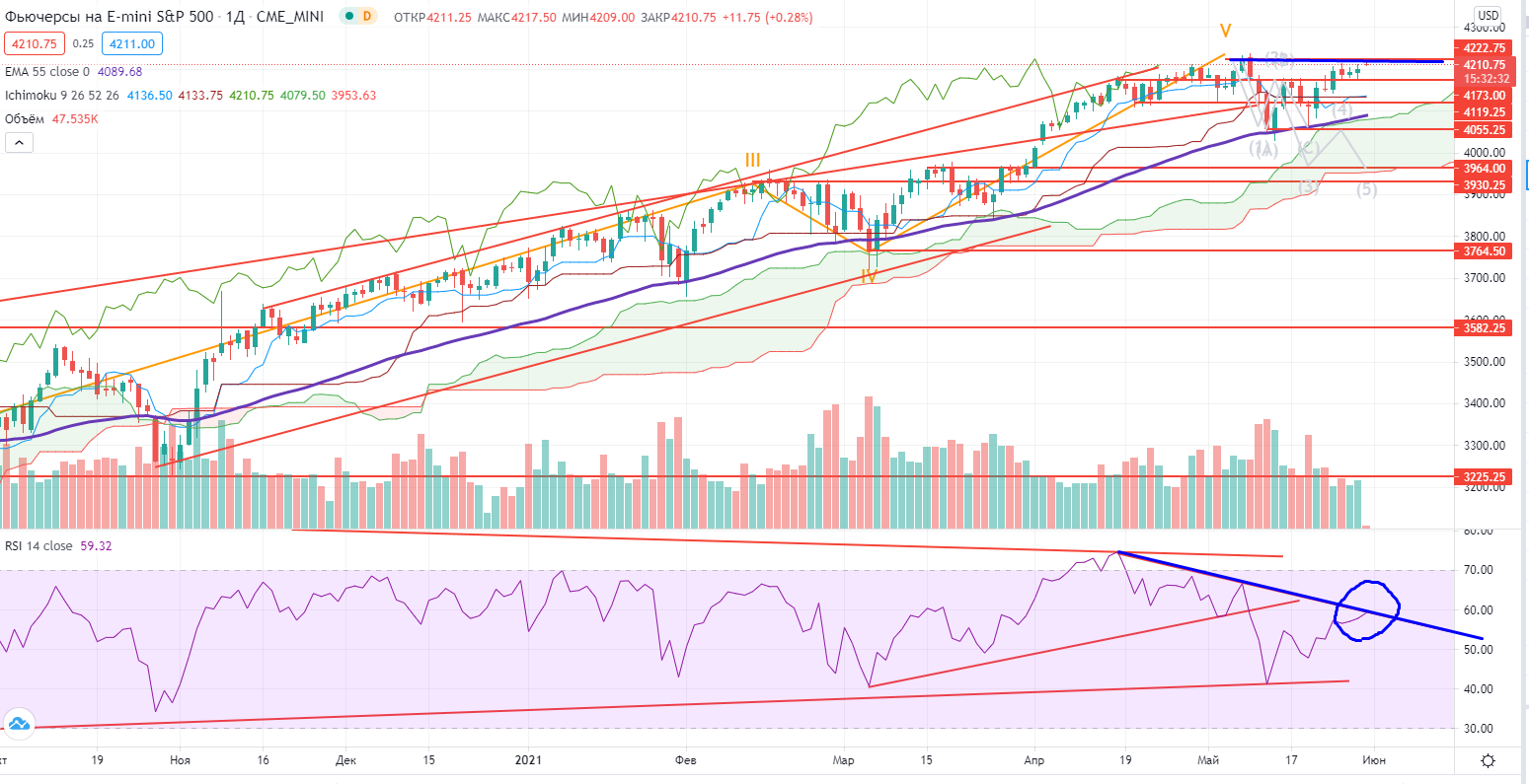 RSI во фьючерсе S&P под трендом, цена под хаем..