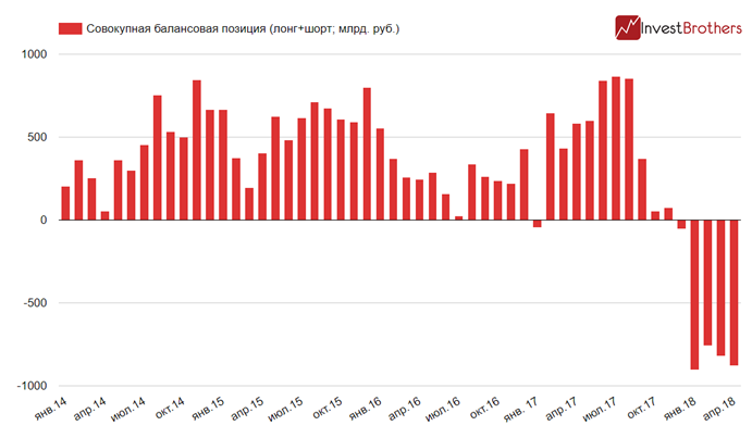 Согласно данным Банка России, по состоянию на 01 апреля чистый "шорт” по доллару был равен 877,8 млрд рублей, что всего на 27,9 млрд рублей меньше рекордного уровня, установленного в декабре 2017 г.