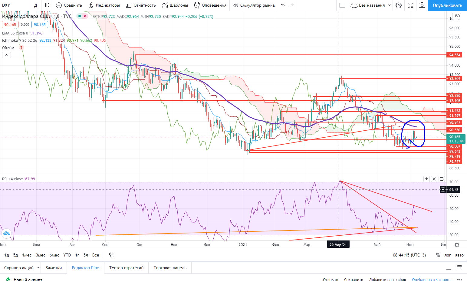 DXY в связи с ростом американских индексов снова начал падать, что косвенно подтверждает мою теорию про инфляционное давление на доллар.