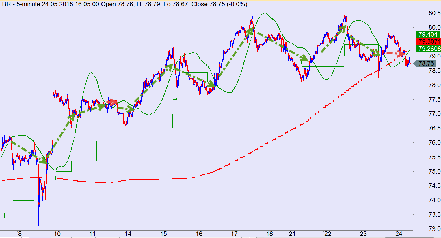 Как видим тут на примере стандартного трендового индикатора, как ведёт себя нефть в моменте. Зелёными стрелочками показаны трендовые прибыльные входы на пятиминутках. Красными убыточные. Вчерашняя убыточная стрелочка была исключительно на новостях. Затрендованность в жиже сейчас довольно интересная.