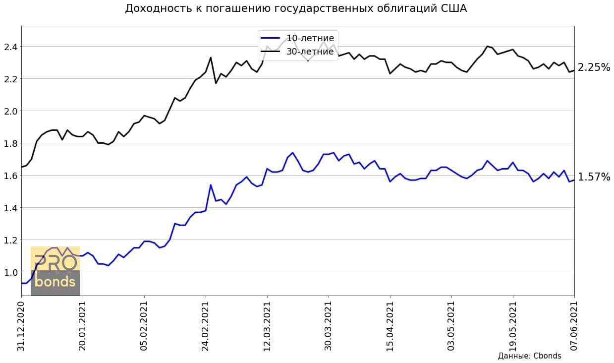 Доходность по 30-ти летним и 10-ти летним бумагам снизилась на 0.03 п.п. до 2.25% и 1.57% соответственно.
