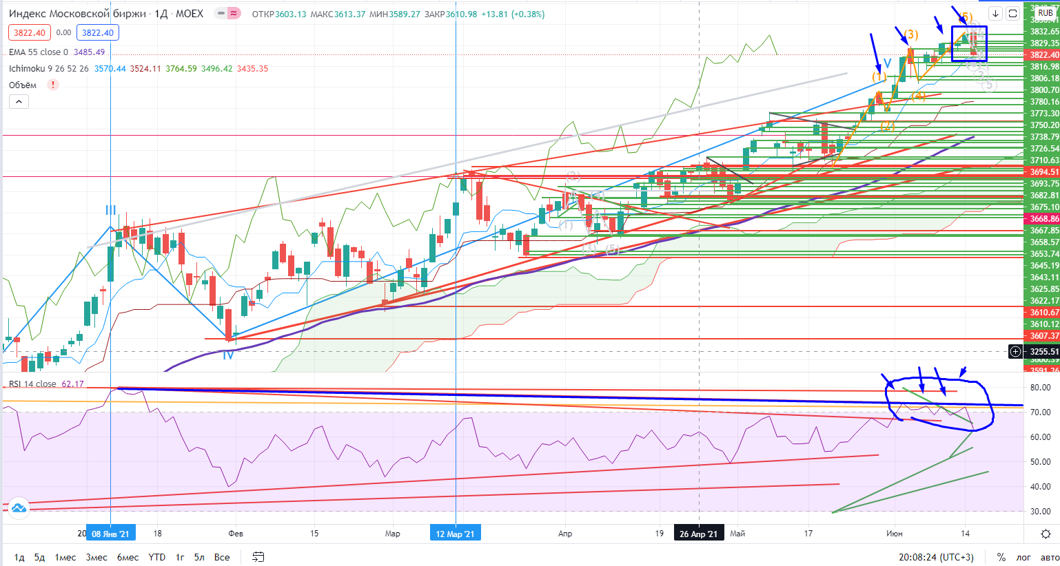 17 июня нас ждет еще и НАША квартальная экспирация фьючерсов и опционов. Поэтому есть все шансы до этого момента продолжать рост. Но вчера Индекс ММВБ нарисовал очень неприятную картину для быков. Помимо свечи, которая может стать предвестником медвежьего поглощения, на часах почти все индексообразующие бумаги находятся ниже зоны облака Ишимоку и ниже 55EMA. Это не повод для продажи конечно, ведь пока на днях бумаги выше зоны покупки, но может стоит задумываться о частичной фиксации. ХОТЯ РЫНОК НЕОДНОРОДНЫЙ, И ВСЕ МОЖЕТ ВЕРНУТЬСЯ ОБРАТНО!!!