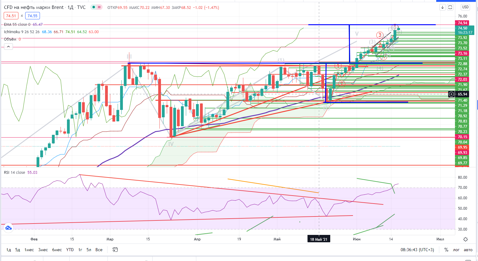 Нефть продолжила рост на фоне пока инфляционного роста (напомню про мишень $75± от пробоя канала ( https://www.finam.ru/analysis/marketnews/neodnorodnost-rynka-porazhaet-20210602-09300/) и на фоне временного ступора в иранских переговорах. Хотя рост происходит очень неровно, с постоянными миникоррекциями, но пока поступательно вверх…