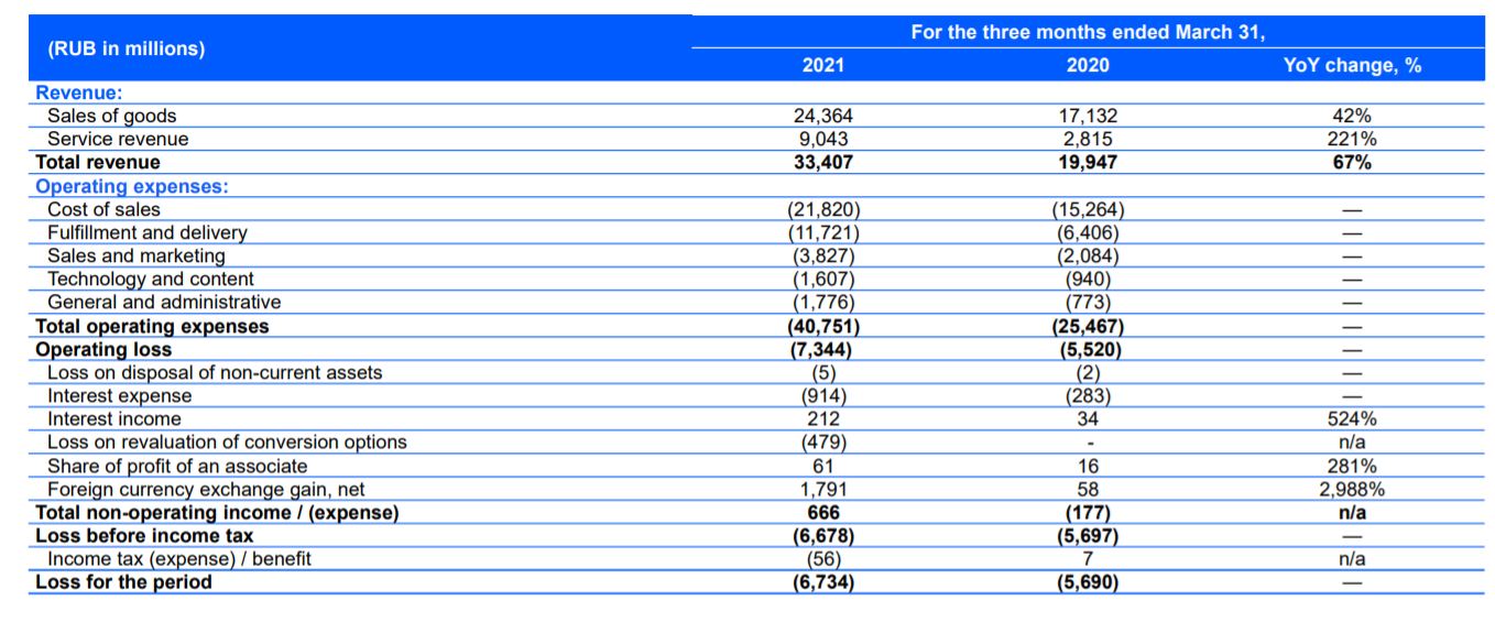 По результатам хорошо видно, что бизнес Ozon быстро набирает обороты. Главная метрика — оборот от продаж (GMV) - растёт более 100% уже 6 кварталов подряд. Скажем спасибо пандемии. В этот раз рост составил 135% год к году, с оценками менеджмента, что рост за 2021 составит около 100%. Выручка подросла ещё на 67% до 33.4 млрд рублей и уже почти догнала результаты за 2018 (37.2 млрд).