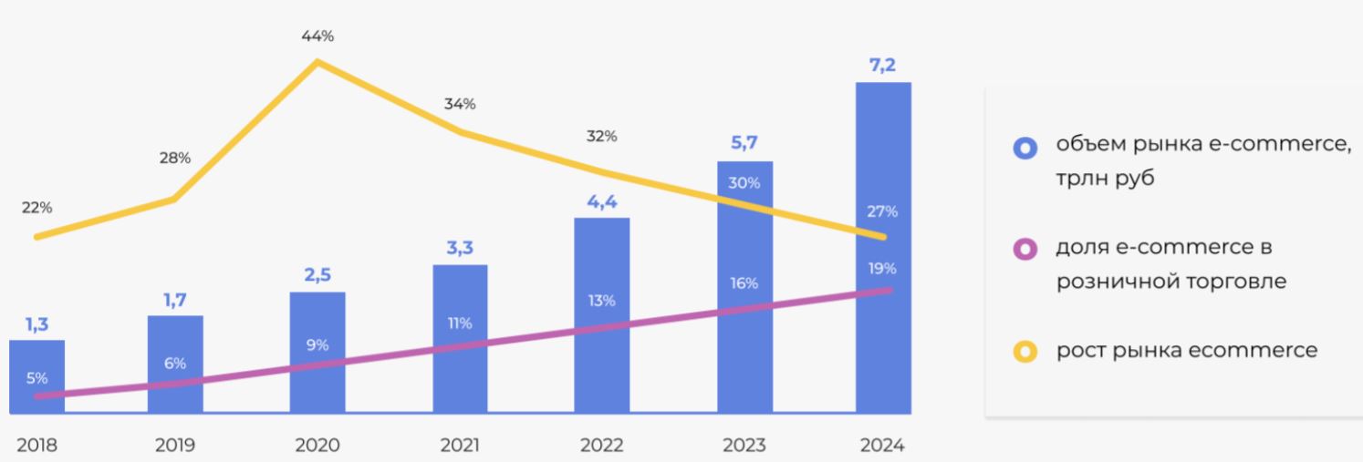 - Сегмент электронной коммерции в зачаточном состоянии. По данным Tadvisors, доля электронной коммерции в России около 9% розничного рынка, в то время как в развитых странах 20%-30%. Аналитики предсказывают, что рост рынка продолжится на среднем уровне 30%, а общий рынок удвоится к 2024 году. Всё это значит, что пирог достаточно большой, чтобы поддержать много “едоков” сразу и Озону есть место куда развиваться.