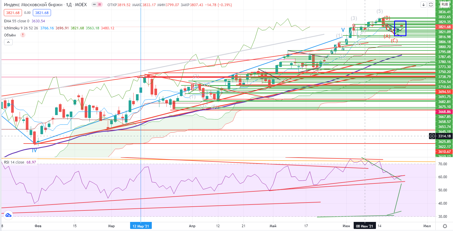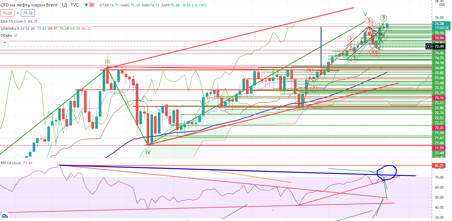 Как и писал накануне (https://www.finam.ru/analysis/marketnews/ustoiychivyiy-rost-nefti-poka-pod-voprosom-20210622-09200/) — «пока нефть находится в v-ой волне с дивергенцией, устойчивый рост будет постоянно находиться под вопросом.» Так и случилось вчера, по утру она вроде как показывала неплохой рост, но потом «вдруг» наступила мощная коррекция, которую я решил откупать и просто чудом «отпустили» под вечер. Нефть продолжает находится в V-ой волне глобального роста, так что в глобальном плане ничего не поменялось-рост, если и продолжится, то он будет устойчивым ТОЛЬКО ПРИ СЛОМЕ ПОТЕНЦИАЛЬНОЙ ДИВЕРГЕНЦИИ!!!
