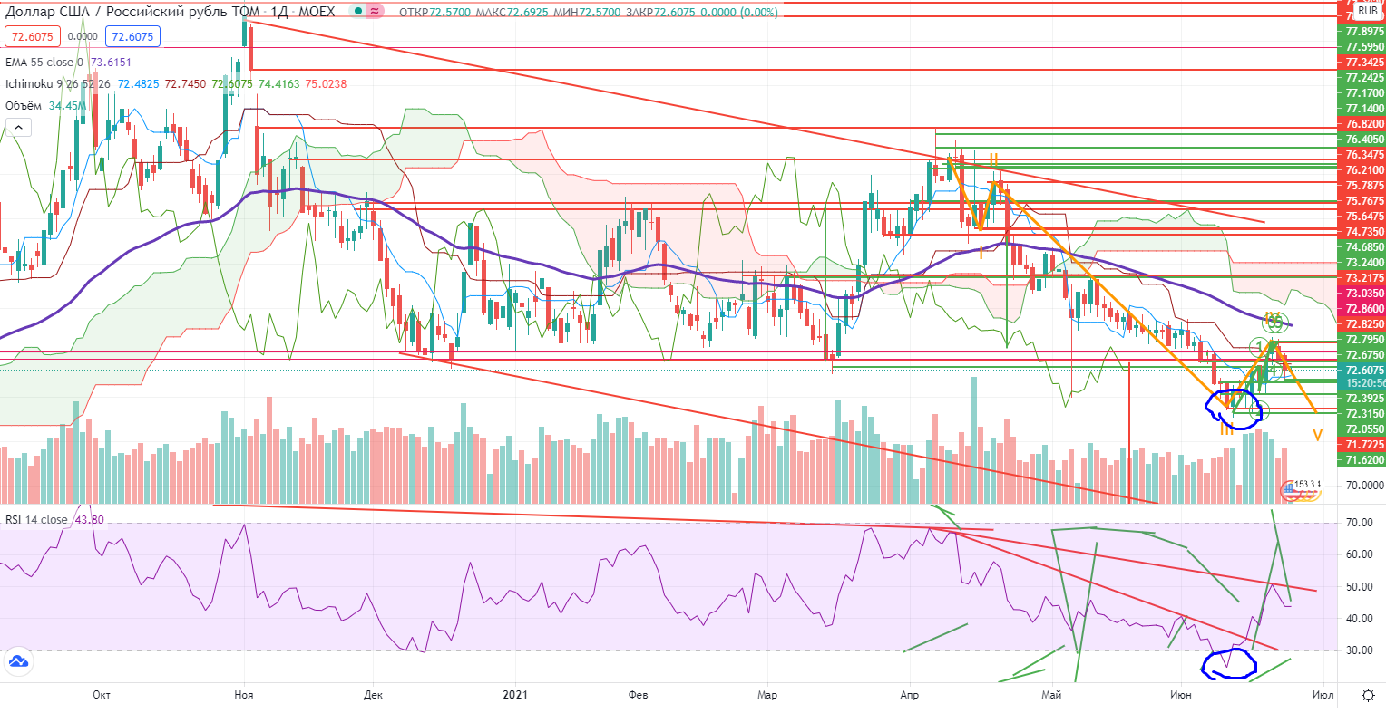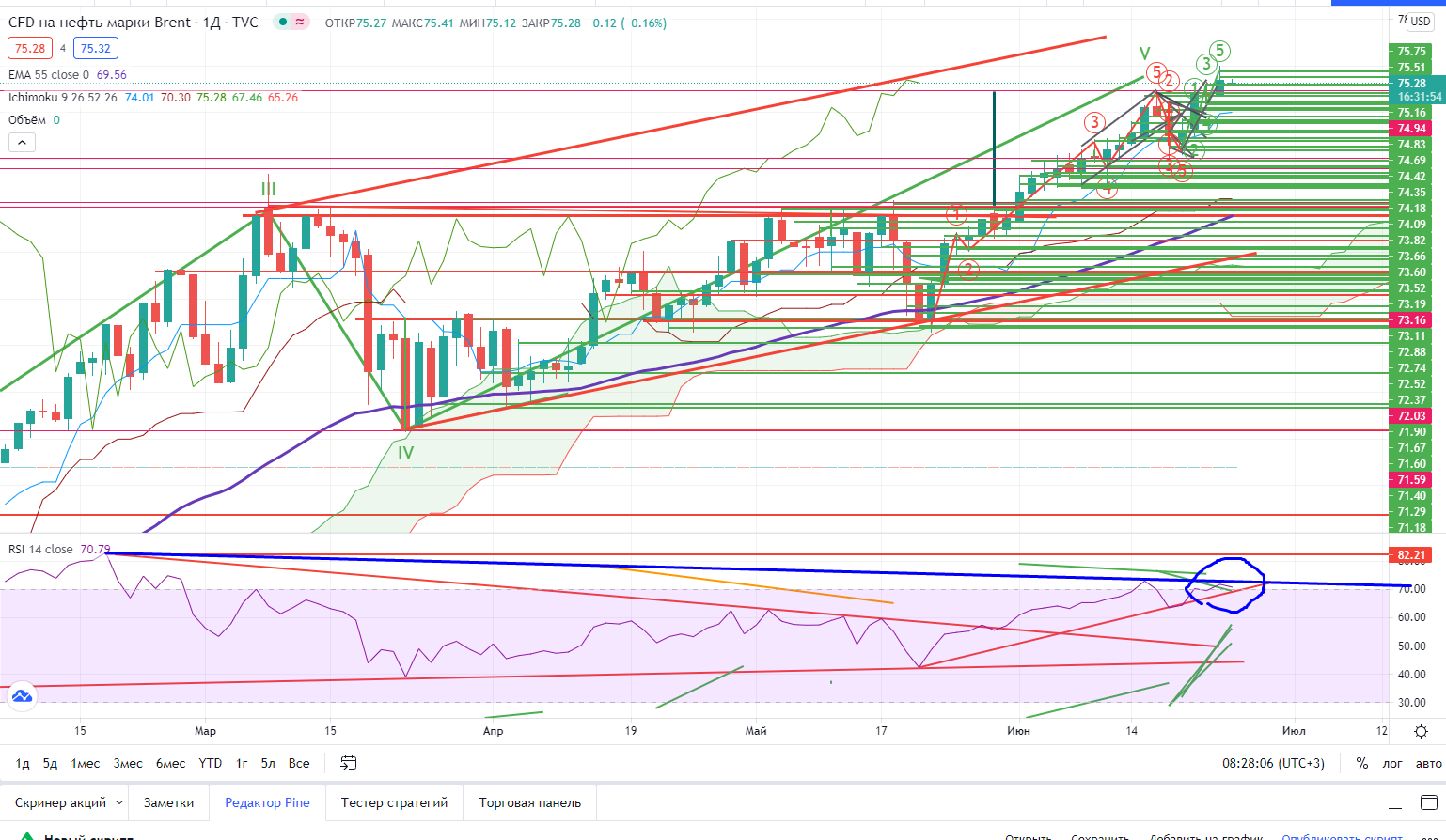 Как и ожидалось основная интрига снова притаилась в нефти, и самое главное в реакции нашего рынка. Нефть по утру показывала более-менее устойчивый рост, но даже на часах каждый новый хай сопровождался дивергенцией, я уж молчу про дневной график, там дивергенция продолжает быть. И даже на вышедших данных по запасам (вышли ожидаемыми (как API и предсказывал)), реакции нефти почти нулевая… Но потом толи дивергенция сработала, толи не понятно что, но по факту нефть пошла вниз… Анализировать нефть в данном случае адекватно нельзя, т.к. эффект инфляции может пересилить многое, но не факт, что с увеличением добычи странами ОПЕК и возможностью выхода Ирана на рынок нефти не окажет отрицательного влияния на котировки… Короче говоря очень запутанная ситуация.