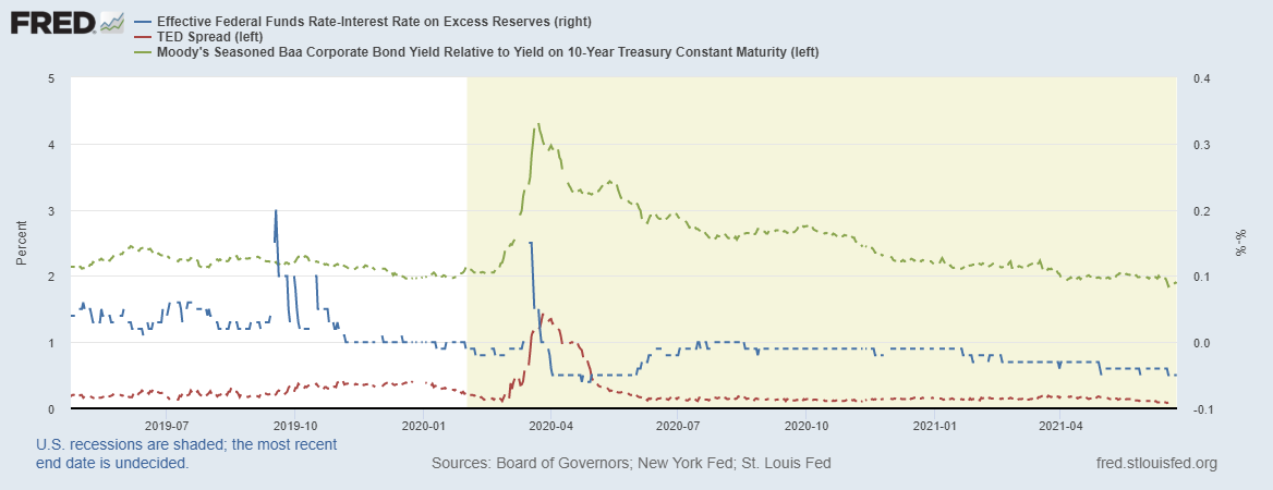 Зеленая линия – это разница между доходностью корпоративных 10-летних облигаций и соответствующих трежерис, ситуация на рынке корпоративного долга стабильная и показатель обновил докризисные уровни.