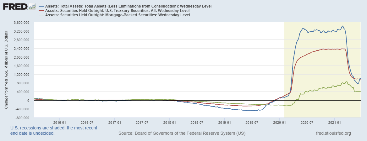 Синяя линия - баланс ФРС от года к году.