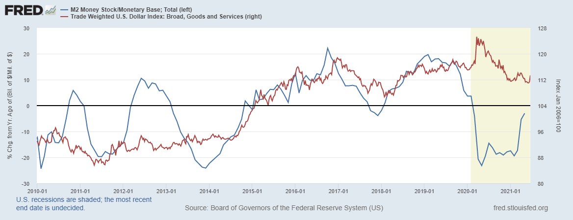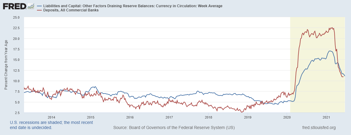 Если обратится к классическому банковскому мультипликатору, то в мае мы наблюдаем резкий рост относительно мая 2020 года, что проиллюстрировано синей линией на картинке ниже