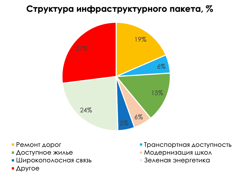 Изначально, в апреле 2021 года, лидер от демократической партии в США представил инфраструктурный план объемом $2,3 трлн, в рамках которого расходы были бы распределены на горизонте следующих 8 лет на: