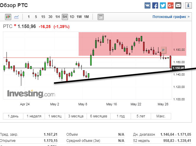 В данный момент индекс вышел из своей консолидации в районе 1170-1200 и упал на свой краткосрочный тренд в районе 1150. Цель движения выхода из консолидации пролегает ниже тренда. После пробоя тренда импульс вниз может получить продолжение.
