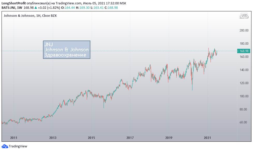 Продукты Johnson & Johnson продаются в 175 странах. Очень сильная компания, капитализация 444.9 млрд