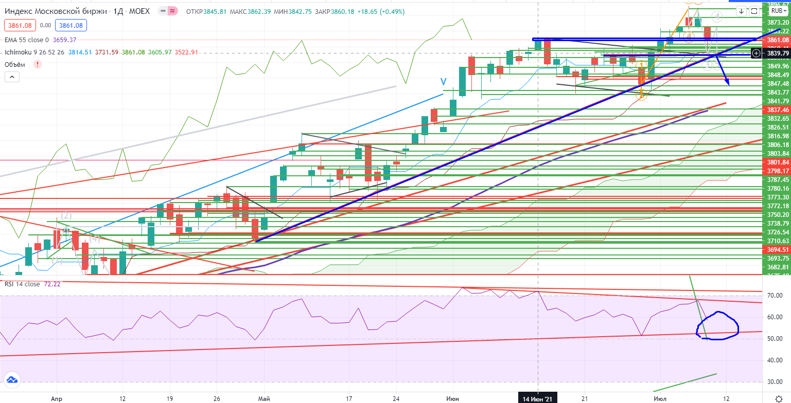 Индекс ММВБ закрылся на локальной поддержке 3860-3864 (в моменте проходил ее), но пока выше горизонтальной поддержки 3837 и тренда. RSI имеет «дырку» с дивергентным трендом, так что есть еще возможность и дальше припасть. А я об неоднородности роста говорил...Проход и закрытие ниже 3837- может повлечь дальнейшее снижение…