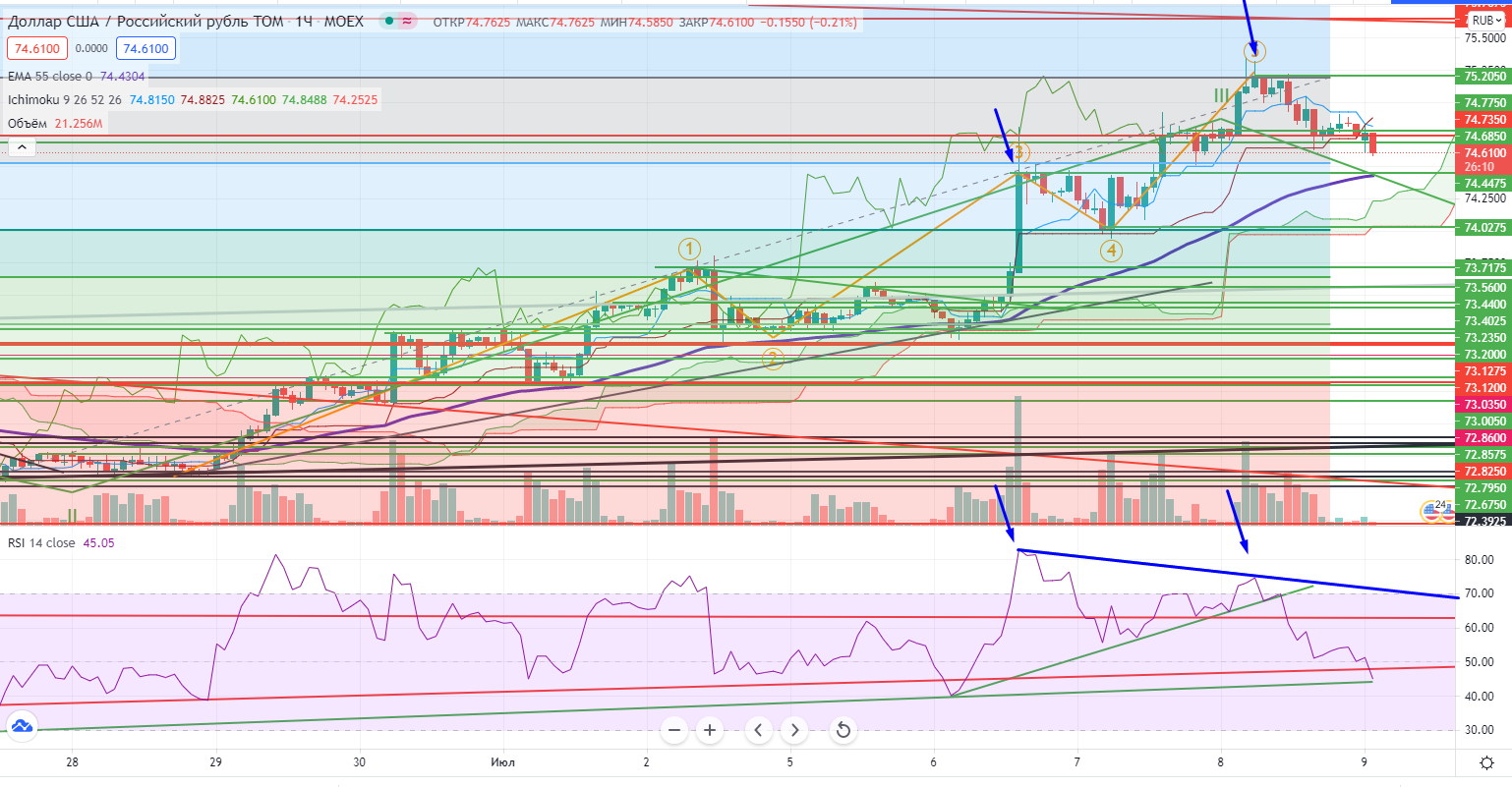 USDRUB на днях находится в III-ей волне, коррекцию надо откупать в расчете на V-ю… Но на часах нет однозначного уровня для покупки, можно только гадать, есть что-то напоминающее «скопление» факторов, так есть полка 74,44 (горизонтальный уровень), 55ЕМА и RSI подойдет к тренду… Большой вопрос про стоп, т.к. на днях все идет в рамках волны III, будет V-я почти однозначно!