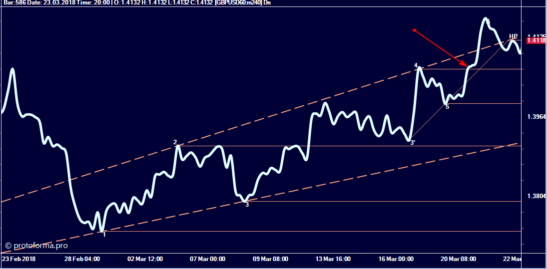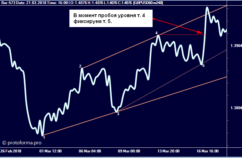 По правилам, в момент пробоя уровня т.4 у нас есть т.5 ( абсолютный экстремум на отрезке 4-уровень подтверждения 4 )и получаем модель первого прохода, - МДР (модель динамического равновесия) с дальней НР, редкий случай: