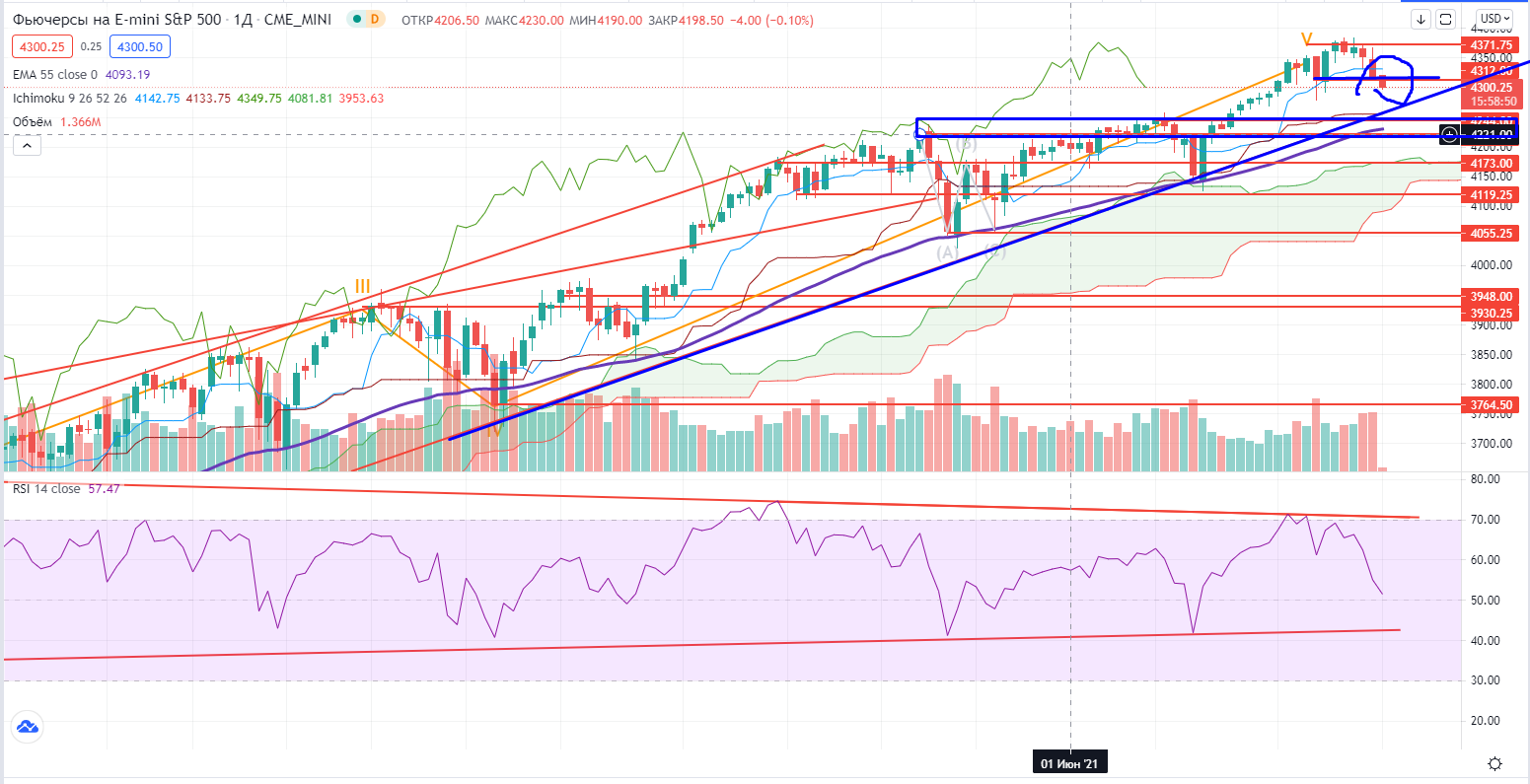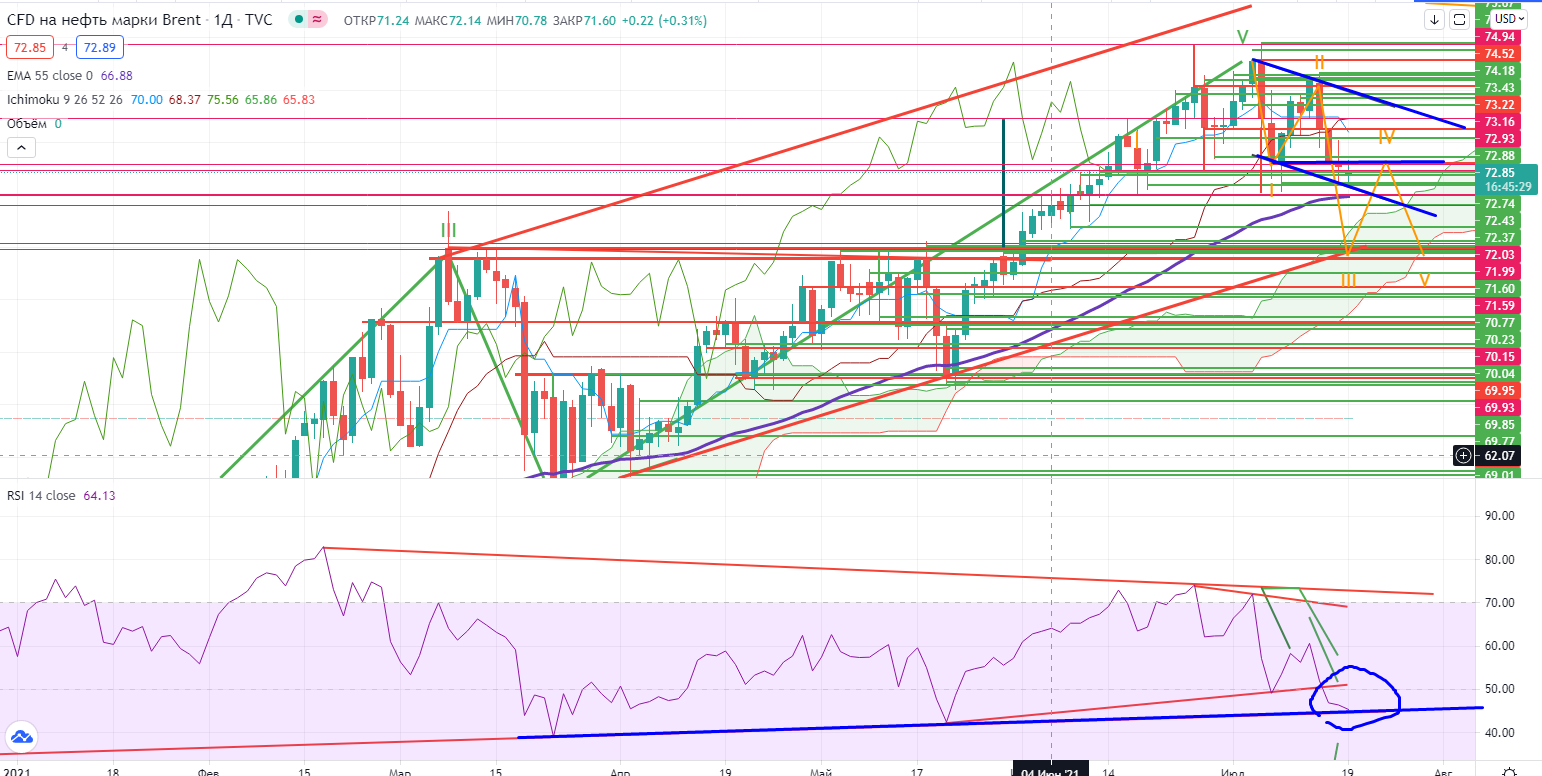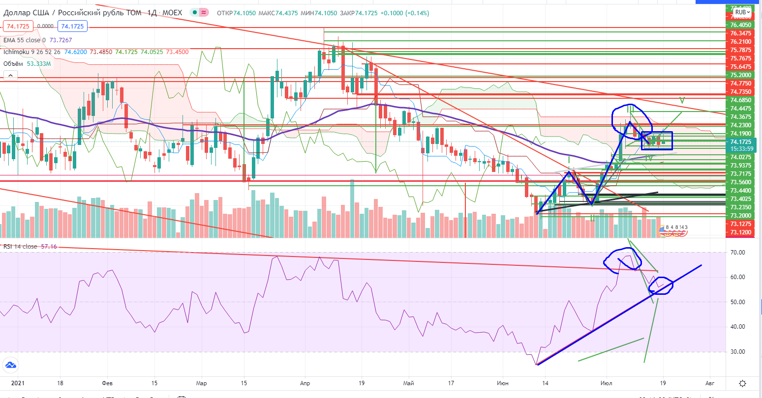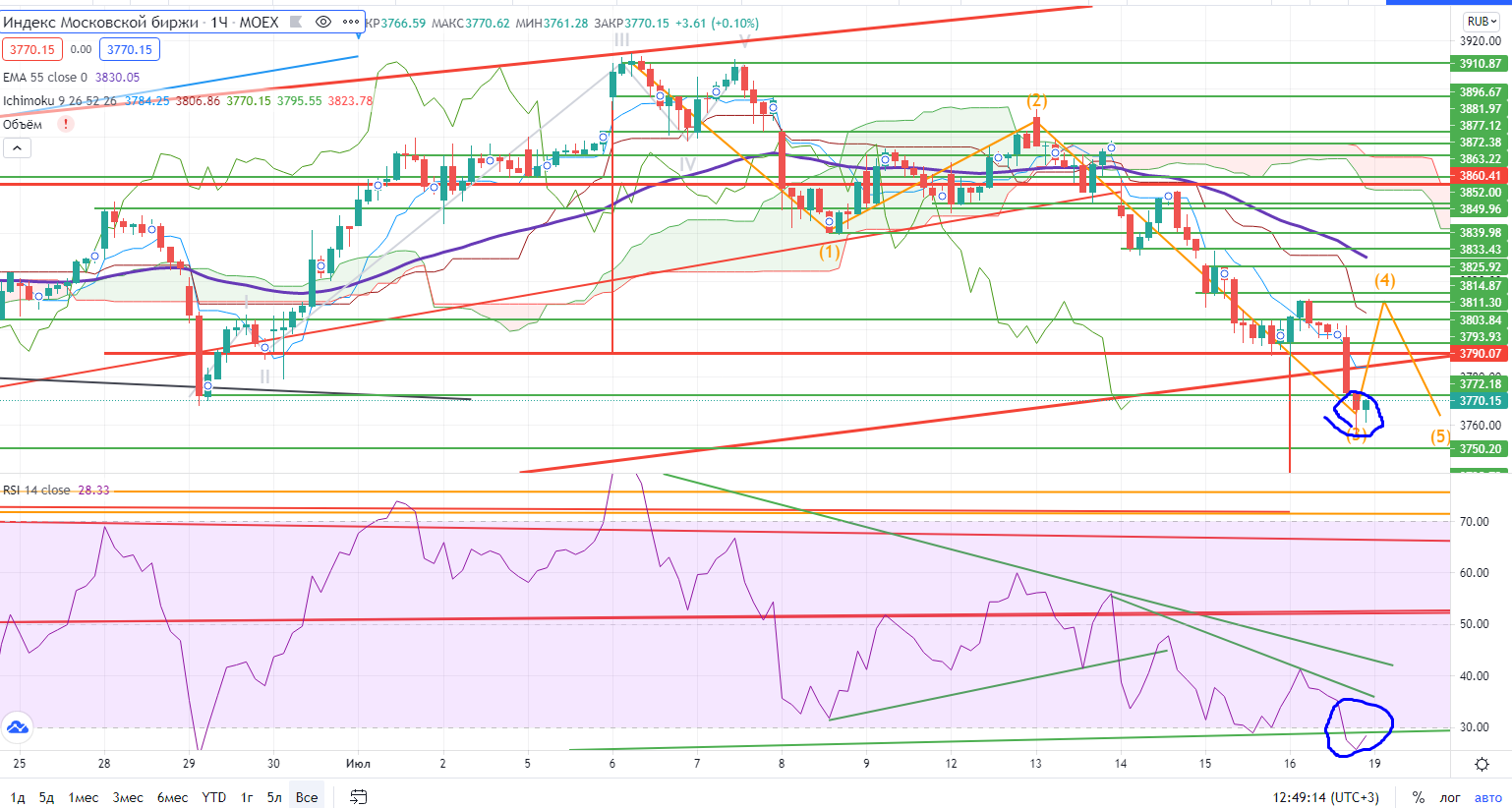 На днях же индекс прошел вниз из канала. Мишень от пробоя канала = 3685, что примерно совпадает с зоной поддержки 3695...Основные дивидендные отсечки уже прошли, так что наш рынок стал чище ( https://www.finam.ru/analysis/marketnews/neft-nakonec-to-groxnulas-20210708-09250/) . Но есть некоторые сомнения, т.к. пока индекс выше зоны покупки (облако Ишимоку+55EMA), так что даже сейчас пока нет четкой уверенности в продаже. Но на часах очень похоже, что все-таки недопадали, т.к. RSI на крайнем импульсе не было дивергенции, это только 3-я волна импульса вниз, значит повтор этого лоу возможен!!! Отскок=продавать!!!