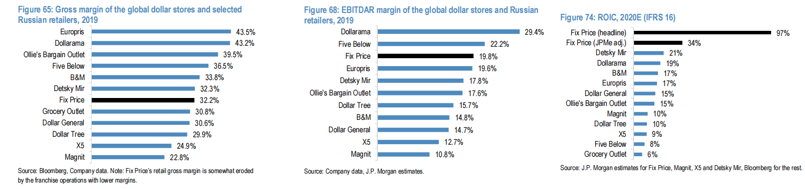 Если взглянуть на мультипликаторы прямо в лоб, то Fix Price может показаться чрезвычайно переоцененным. Все мультипликаторы в 2-3 раза выше, чем у остальных российских ритейлеров. А если перевести на более практичные цифры, то рынок оценивает среднестатистический магазин Fix Price примерно в 6 раз дороже Магнита или в 4 раза в случае с Х5.