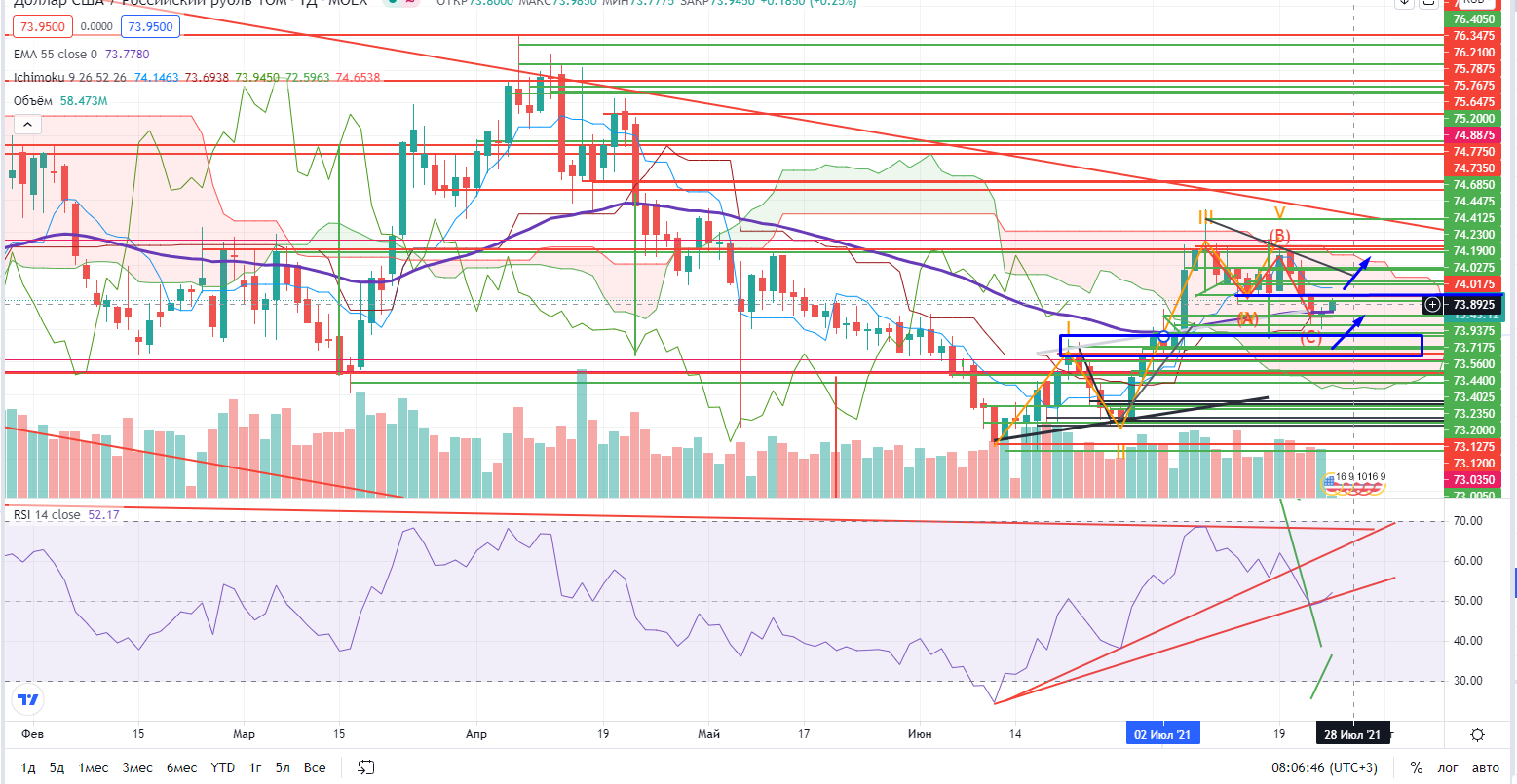 Пара либо движется к мишени от пробоя канала 74,07-74,73=73,41, там можно начинать встречать покупкой до 73,13 со стопом 72,95 ПО КОНЦУ ДНЯ, либо появилась вероятность, что это АВС коррекция, и начало формирование новой, более сильной волны вверх. Т.е. есть возможность не ждать похода вниз, и надо смотреть как поведет себя рынок в случае похода в район 74-74,1, возможно там надо будет снова покупать. Это идея номер 3 на эту неделю.
