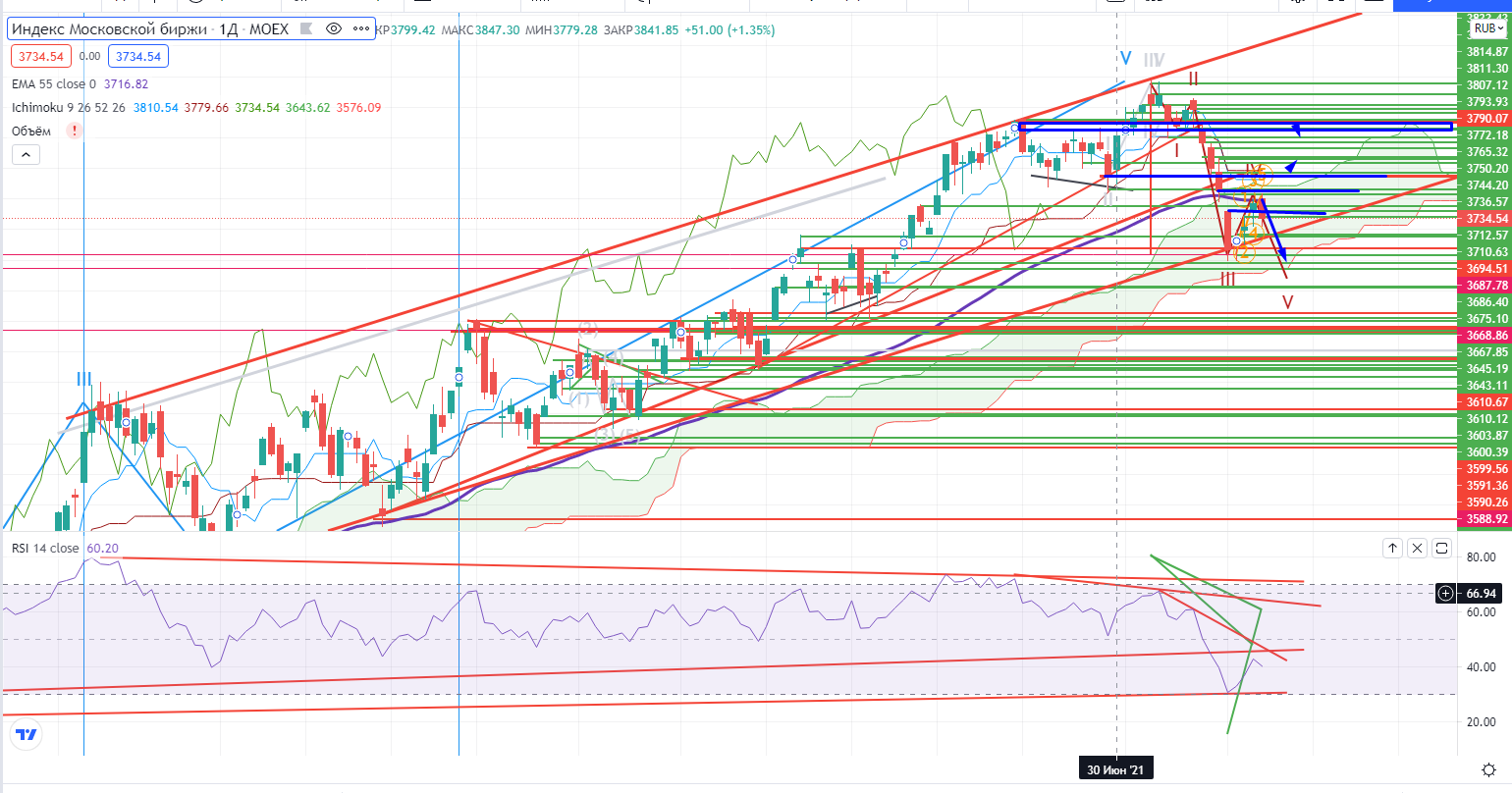 Идея №1. Индекс ММВБ выходит вниз из гэпа, и т.к. не было дивергенции на лоу, поход туда очень возможен…Надо заметить, что даже в случае прохода Индексом ММВБ выше гэпа 3770, он почти сразу упрется в сопротивление 3790-, потом относительно свободная зона, в которой можно даже попытаться торговать от лонга, но до уровня 3855-3860 (реперная зона I-ой волны), там снова можно шортить! Падает наш рынок ОДНОРОДНО, поэтому все таки в среднесрочной перспективе шорт в приоритете!!! А уж на внешнем фоне наш рынок выглядит просто катастрофически слабым..